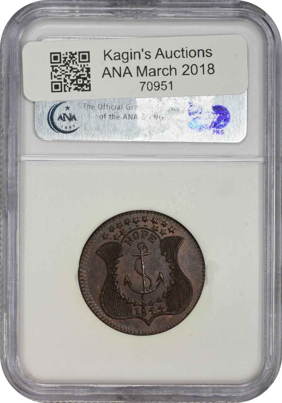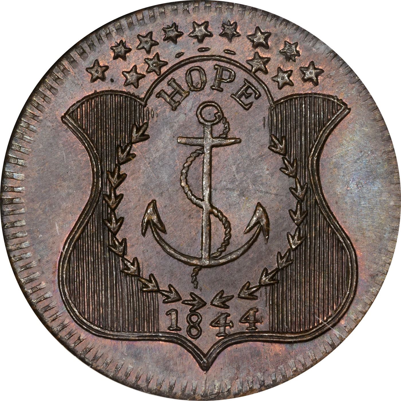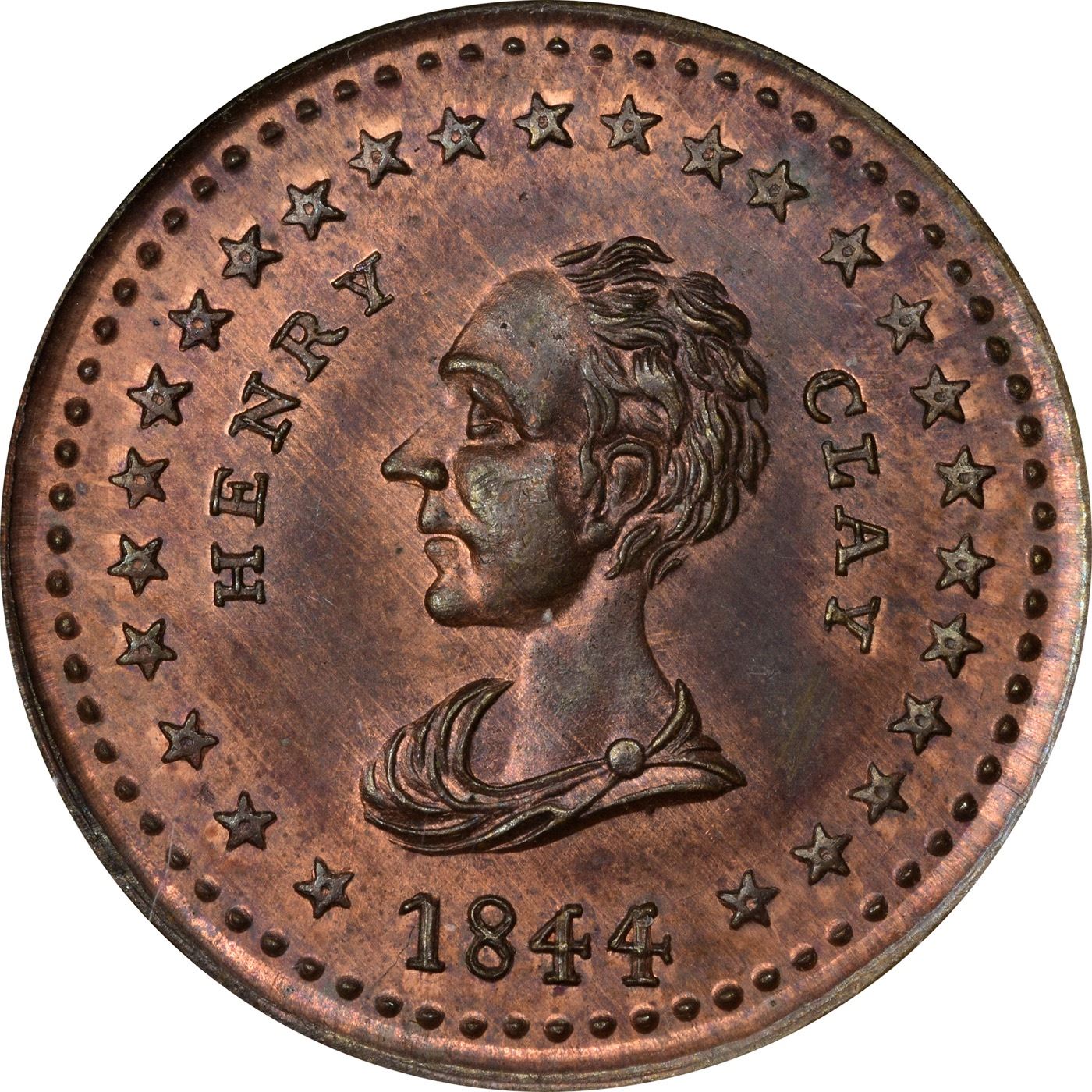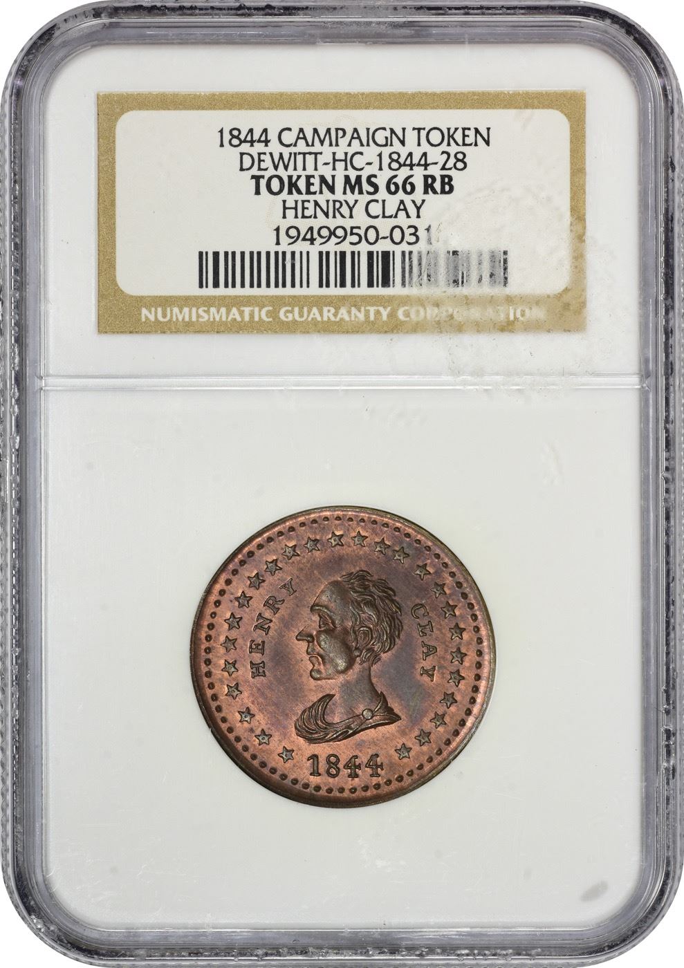 Gem Mint State Henry Clay Token 1844 Henry Clay Campaign Token. DeWitt-HC-1844-28. Copper. MS-66 RB NGC. Obv: toga-clad bust of Clay left, HENRY before profile, CLAY behind head, ring of stars around, date below. Rev: ornate federal-style shield open at top, 13 stars above, HOPE and anchor within, date below. Frosty rose-orange on the obverse, the reverse somewhat deeper throughout. Sharply struck and mark-free, a Gem if there ever was one!