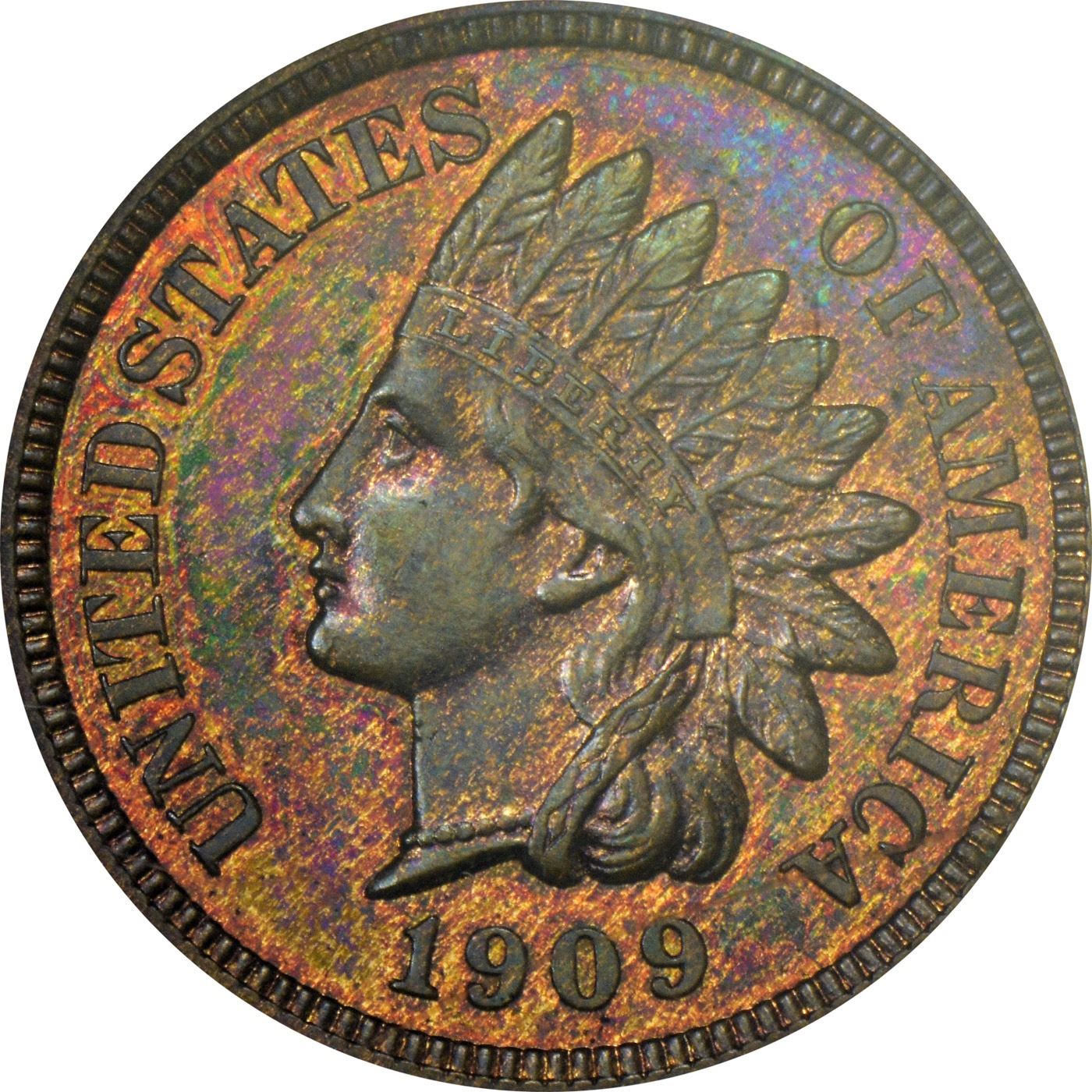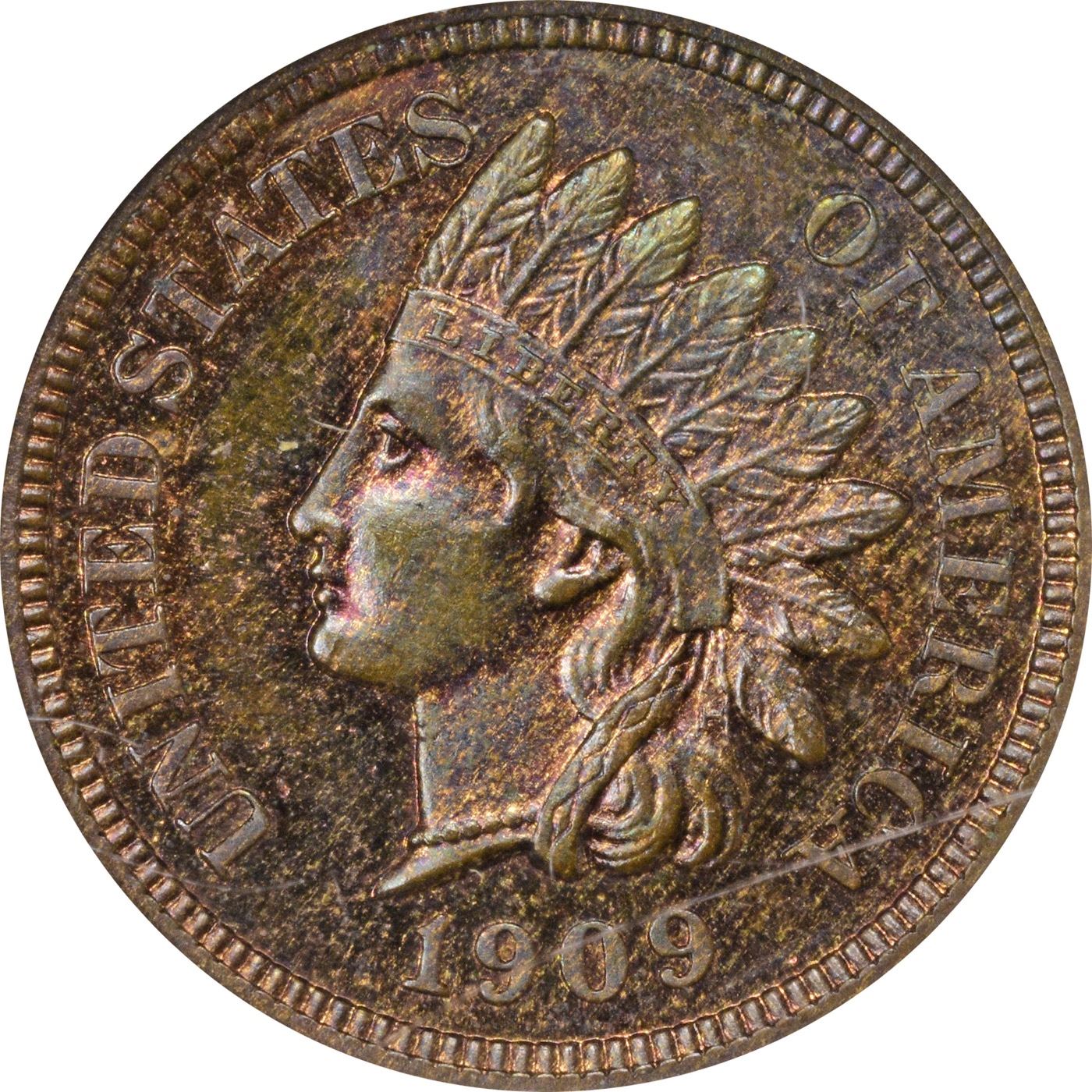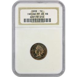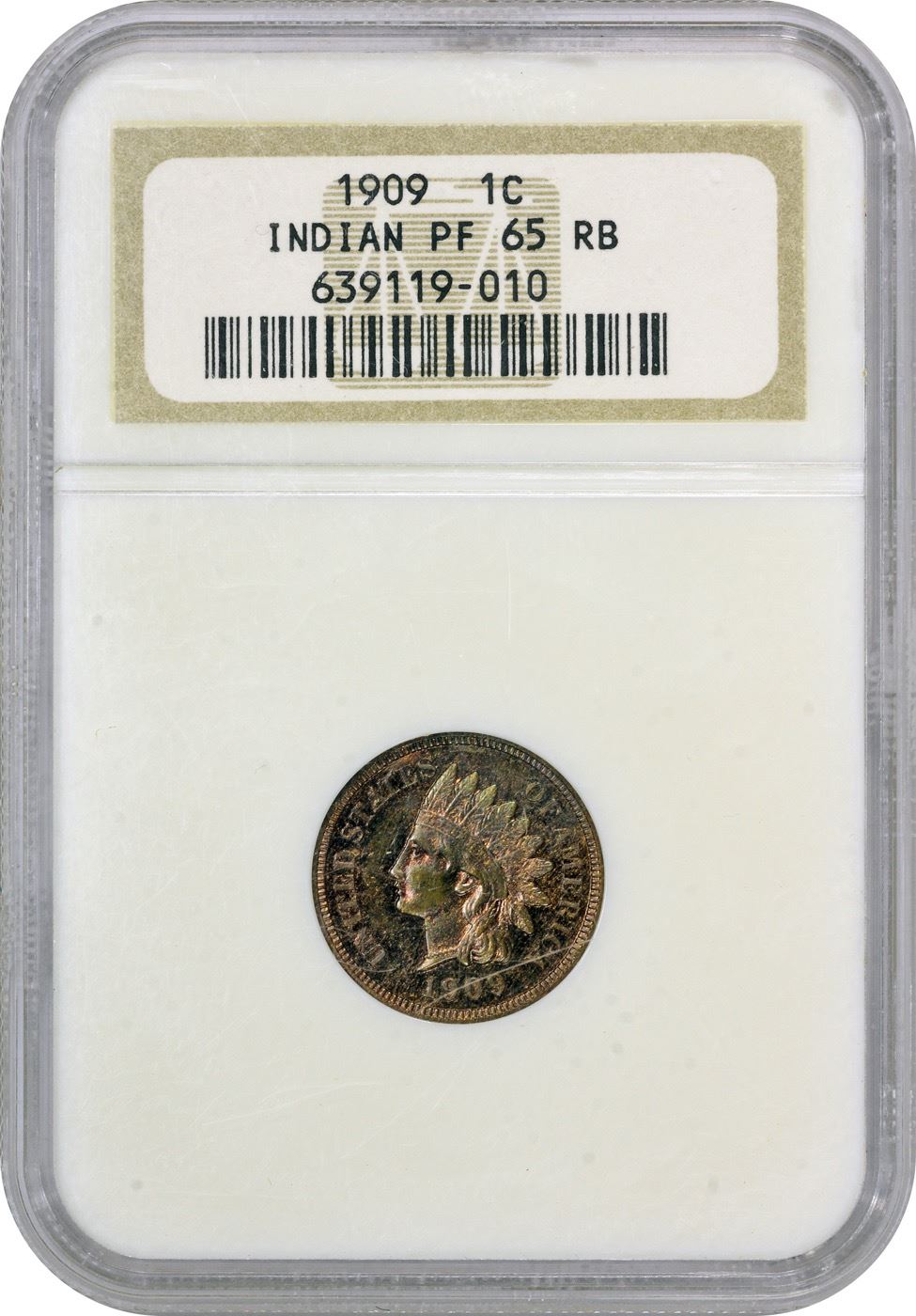 Gem RB Proof 1909 Indian Cent 1909 Indian Cent. Proof-65 RB NGC. The warm tan-brown surfaces erupt in a strong display of vivid orange iridescence under a bold light. The strike is sharp on this example of the final date in the series, and a loupe reveals “crinkly” fields – as often seen in 19th-century gold Proofs – with an attractive sprinkling of rose and blue iridescence throughout. Choice and attractive.
