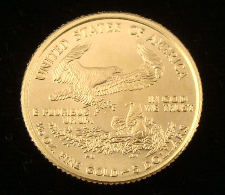 2000 Five Dollar US Gold Eagle Coin * * Weight: 1/10 ounce Content: .999 Fine Gold Size: 16.5mm in diameter Grade: Gem Uncirculated