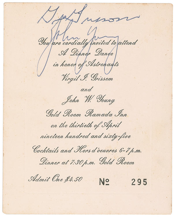 Printed invitation, 4 x 5, for a dinner dance in honor of the Gemini 3 astronauts, held at the Gold Room of the Ramada Inn on April 30, 1965, signed in blue ballpoint by Gus Grissom and John Young. In fine condition, with a bit of scattered light soiling.