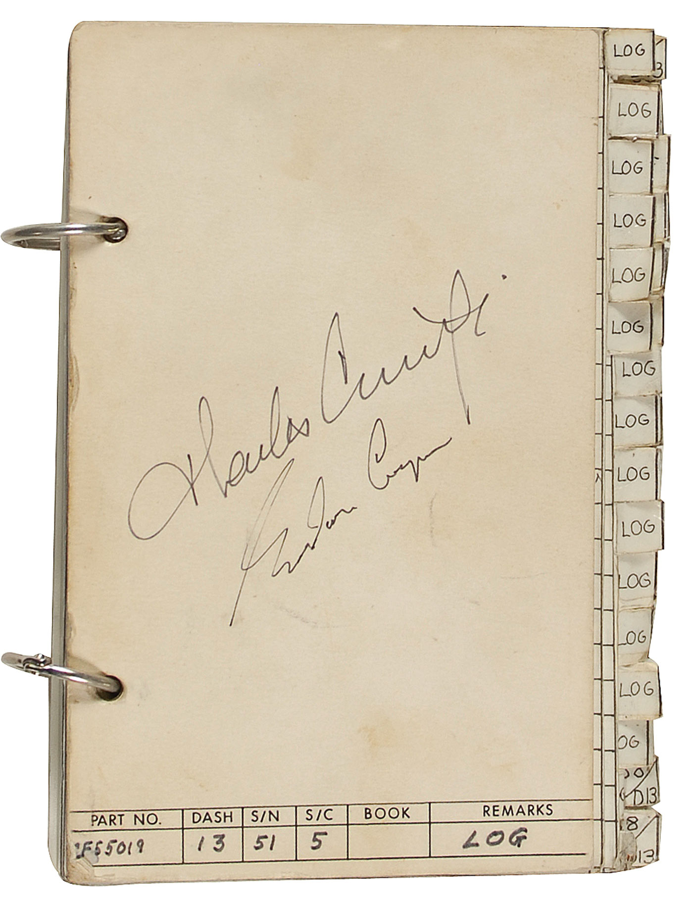 Flight-flown Gemini 5 log book, 5 x 8 book of over 100 pages between two heavy cardstock covers, with two strips of Velcro on the back, and bound by two binder rings. Printed in the lower area of the front cover is "PART NO/ CF55019,” "DASH 13," "S/N/ 51,”, "S/C/ 5,” "BOOK," and "REMARKS/ LOG". This amazing space-flown treasure detailed the thoughts and observations of Charles Conrad and Gordon Cooper during the 8-day mission, August 21-August 29, 1965. Signed on the front cover in black felt tip “Charles Conrad, Jr.” and “Gordon Cooper.”