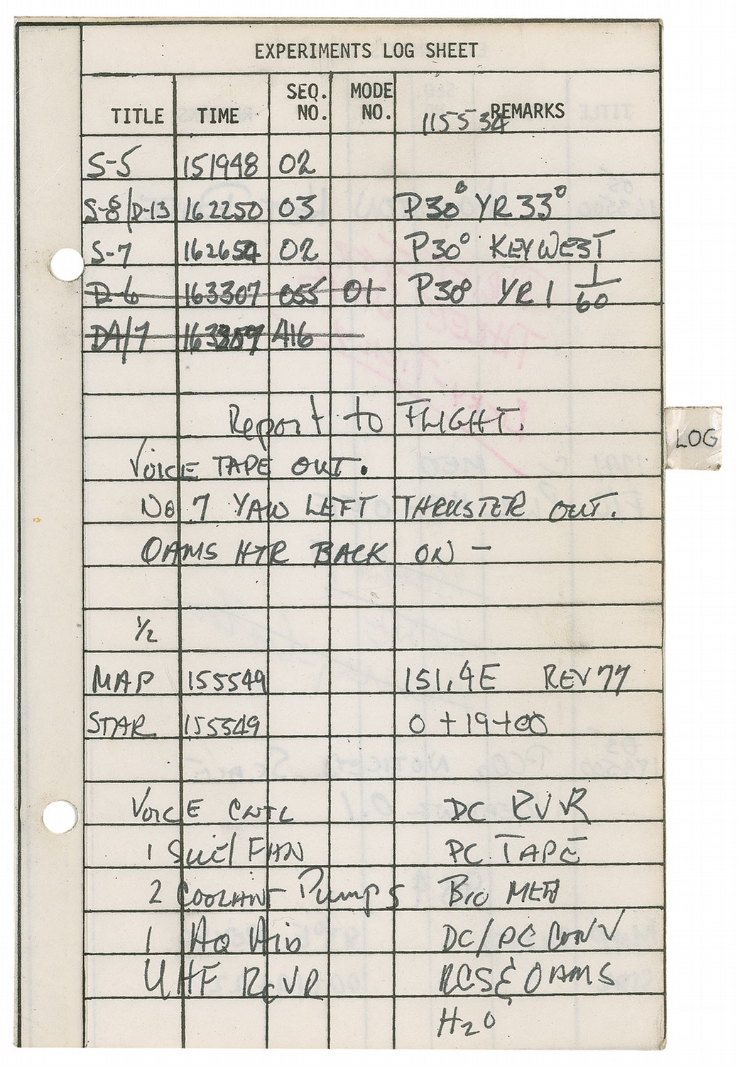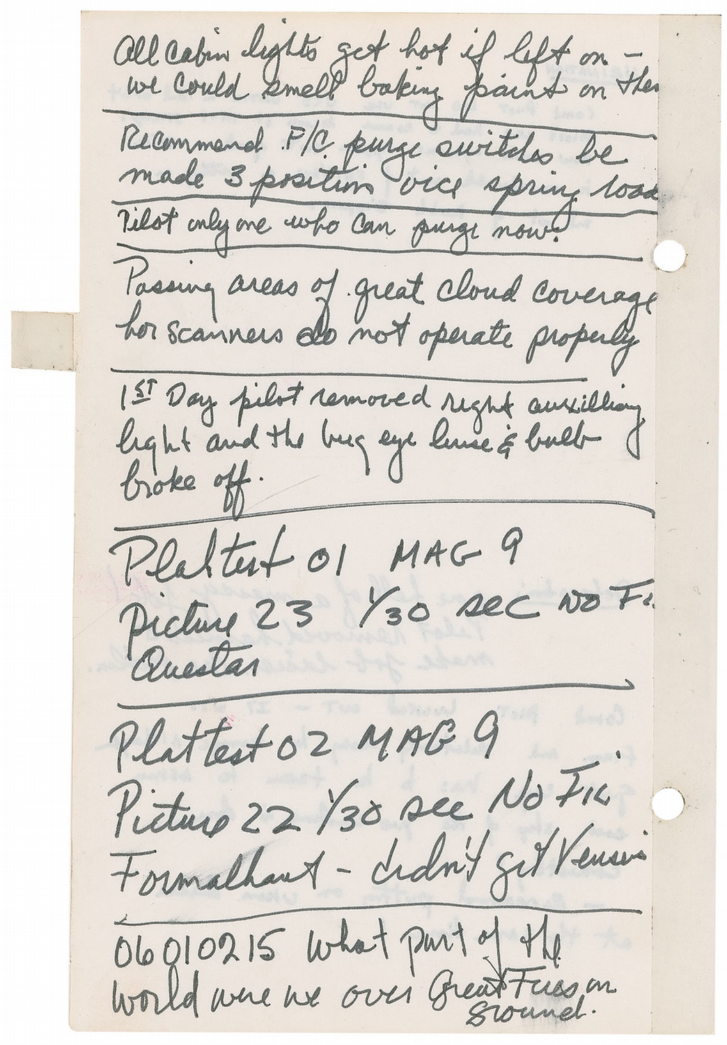 A final page has a detailed description of a potential crisis in the flight: “After much difficulty aligning platform (night) due No.#7TCA being out (we attributed our problems to H2 & O2 venting which causes some pretty high rates (8° and still building) we decided something else was wrong & discovered No. 7 TCA out. I immediately turned the cams htr back on because earlier in the day we had been forced to use direct (same problem) & saw what we think was ran fuel balls drift by (golden spherical balls.) We also, in thinking back, feel TCA 7 was intermittent. We powered down & advised Flight. We went one more orbit & discovered TCA 8 out also. Altho it was firing (we could see flame) we got no thrust. We checked both thrusters later after the heaters had been on still no luck. We will go all night with the heaters. Then make a night check. I feel the OAMS Htrs should never have been turned off. ”