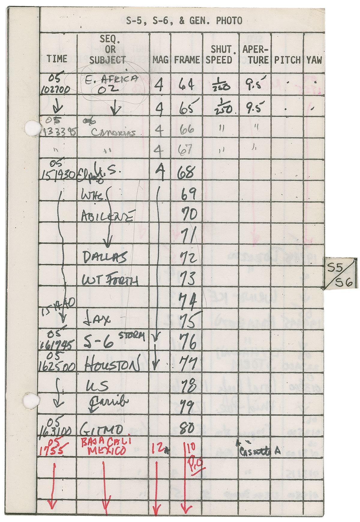 The pages contain the detailed remarks of the crew, including those on pages subtitled “Experiments Log Sheet,” “Inflight Copy Sheet,” and “Cabin Lighting Survey.” Page upon page, about half of the book, is filled with concise abbreviations and numerical values, each note explaining the time of an experiment, the sequence and mode numbers, and any remarks (most often in the form of degree notations). Other detailed notations include “Left roll only with roll logic switch in pitch—no right yaw” and “Right yaw only with roll logic switch in yaw no left roll.” Other handwritten comments are quite remarkable. Under a section titled “01-00-00 Cooper/Conrad Vision Test” Conrad has written such notations as “18-34-38 Laredo Sighting. DID NOT SEE IT,” “18 25 05 Gordo Saw Targets—I didn’t, sorry about that!,” “03 13+32+46 Saw smoke, no targets, bad sun angle,” and “07160040 Saw smoke saw targets. On Gordo’s side he scored 4 & 1 in the first two boxes. Window measurements made.”