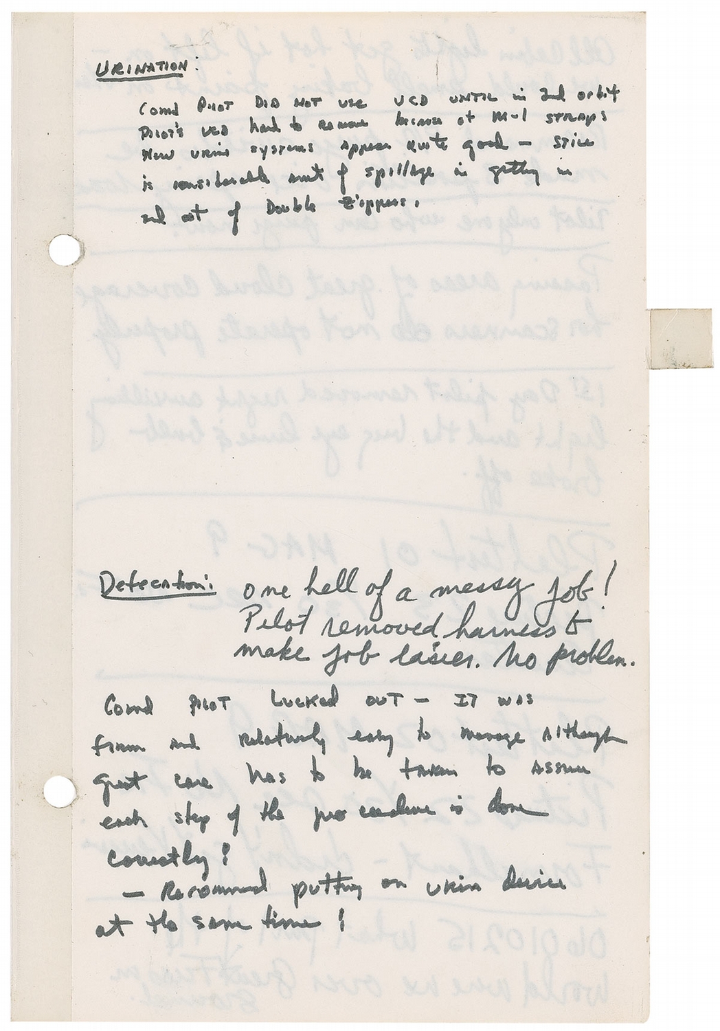 Other noteworthy comments include “Blood pressure/cuff fitting leaded at suit, repaired by using screwdriver in post landing kit,” “CMD Pilot Asleep. Drifting” [though the crew would later report having had had trouble sleeping in alternate sleep periods], and a detailed description of using the restroom in weightless conditions. Cooper has noted, “Urination”Comd Pilot did not use UCD until in 2nd orbit. Pilot’s UCD had to remove because of M-1 straps. New urine system appears quite good—still is considerable amt of spillage in getting in and out of double zipper.” At the bottom of the same page Conrad wrote: “Defecation: one hell of a messy job! Pilot removed harness to make job easier. No problem.” Cooper added, “Comd pilot lucked out—It was firm and relatively easy to manage although great care has to be taken to assure each step of the procedure is done correctly! Recommend putting on urine device at the same time!”