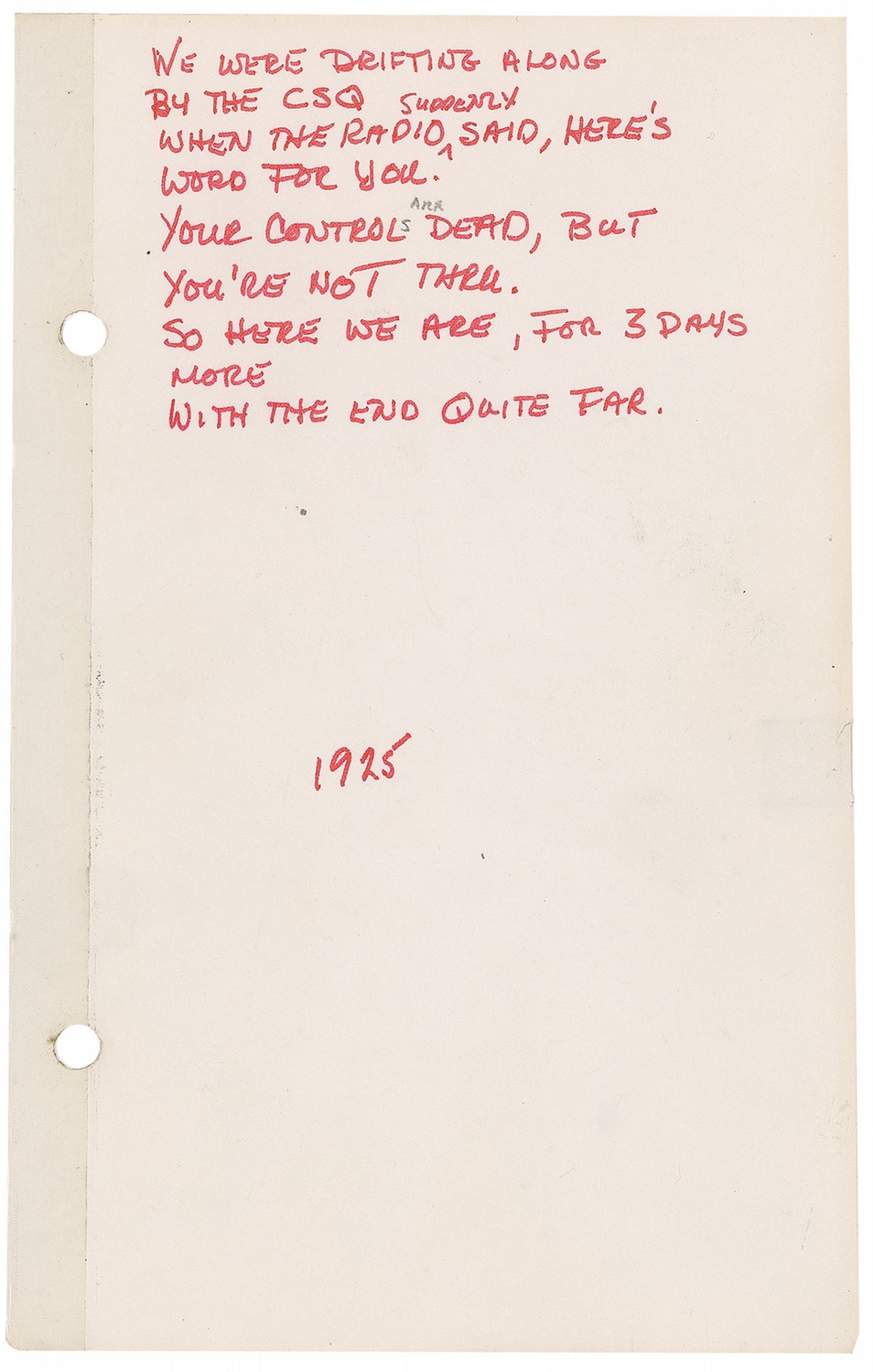 The very last page bears the quotation, “We were drifting along by the CSQ when the radio suddenly said, here’s word for your. Your controls are dead, but you’re not thru. So here we are, for 3 days more with the end quite far.” The words were actually a song, sung to the melody of ‘Moonlight Bay,’ that Conrad and Cooper had created in flight to amuse mission control—and themselves. The ditty was penned after Coastal Sentry Quebec said the ship might have to drift for three days in space, but never performed as, the astronauts later reported, ‘we got busy again.’
