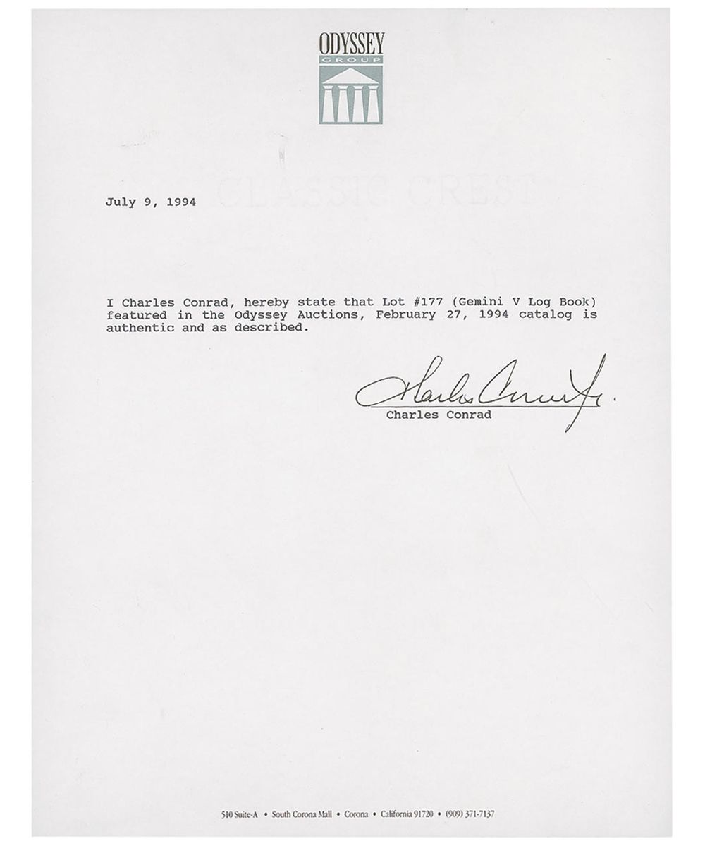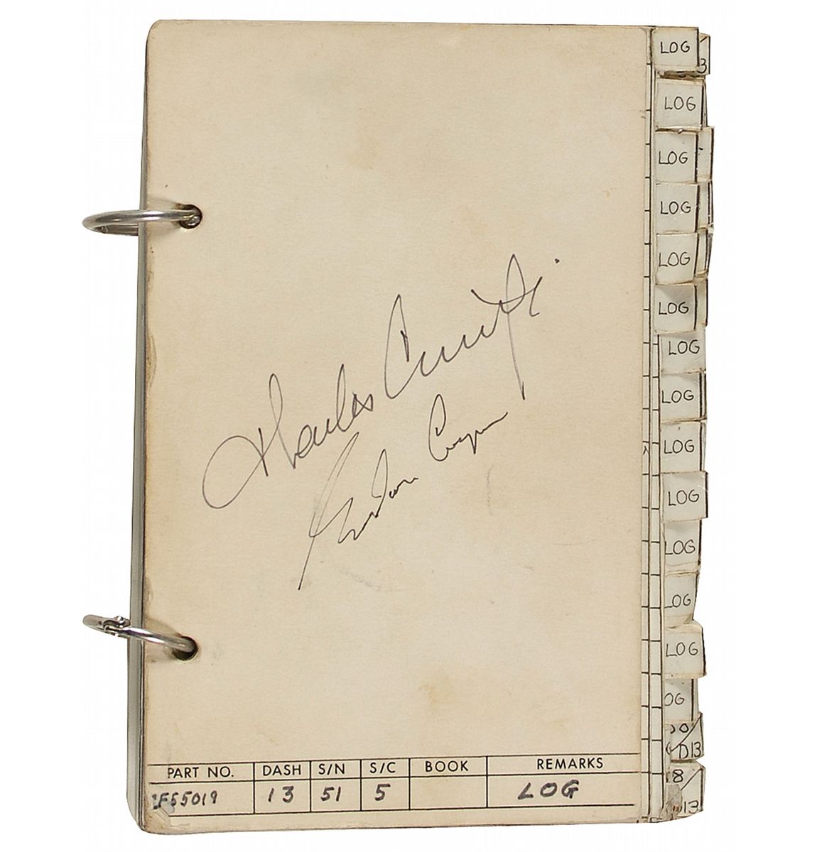 Flown Gemini 5 log book, 5 x 8 book of over 100 pages between two heavy cardstock covers, with two strips of Velcro on the back, and bound by two binder rings. Printed in the lower area of the front cover is "PART NO/ CF55019,” "DASH 13," "S/N/ 51,”, "S/C/ 5,” "BOOK," and "REMARKS/ LOG". This amazing flown treasure detailed the thoughts and observations of Charles Conrad and Gordon Cooper during the 8-day mission, August 21-August 29, 1965. Signed on the front cover in black felt tip “Charles Conrad, Jr.” and “Gordon Cooper.”