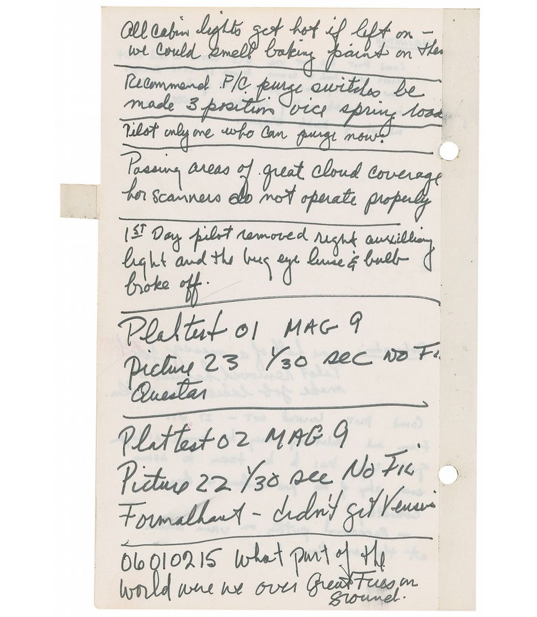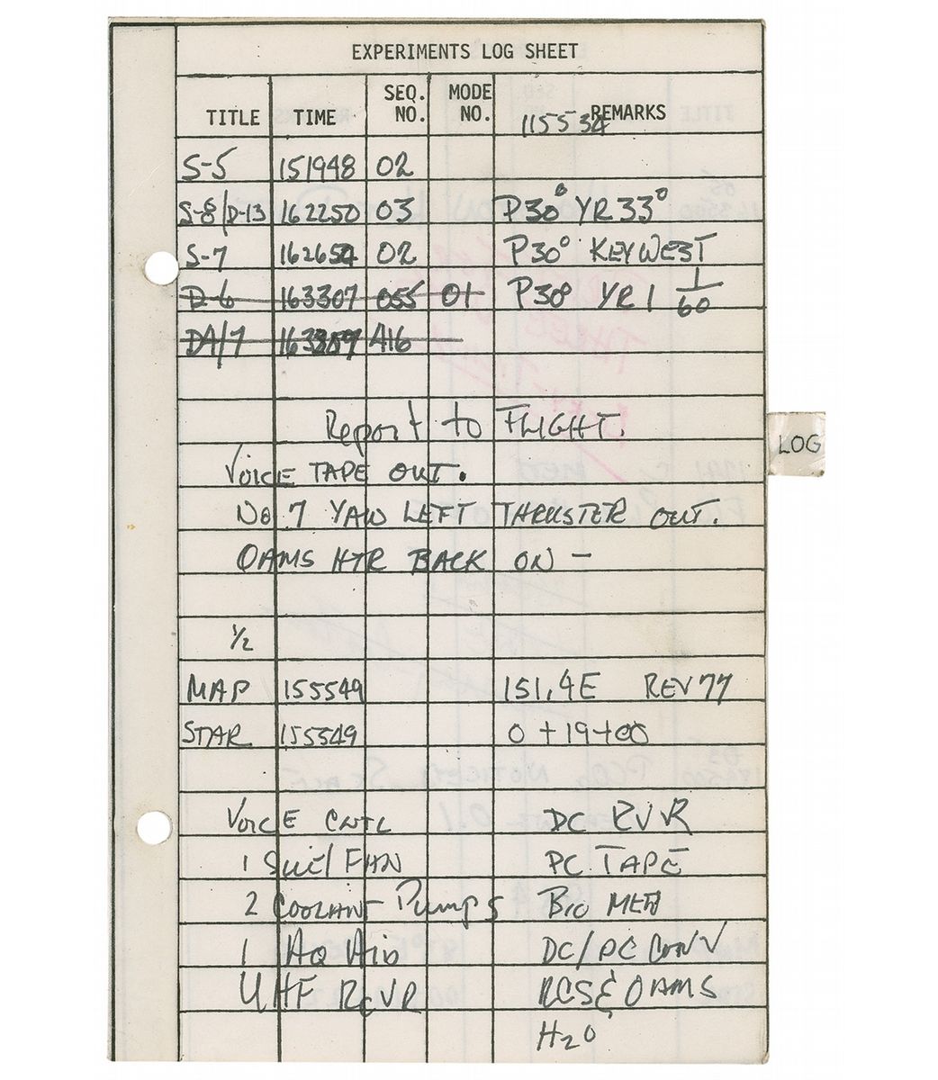 A final page has a detailed description of a potential crisis in the flight: “After much difficulty aligning platform (night) due No.#7TCA being out (we attributed our problems to H2 & O2 venting which causes some pretty high rates (8° and still building) we decided something else was wrong & discovered No. 7 TCA out. I immediately turned the cams htr back on because earlier in the day we had been forced to use direct (same problem) & saw what we think was ran fuel balls drift by (golden spherical balls.) We also, in thinking back, feel TCA 7 was intermittent. We powered down & advised Flight. We went one more orbit & discovered TCA 8 out also. Altho it was firing (we could see flame) we got no thrust. We checked both thrusters later after the heaters had been on still no luck. We will go all night with the heaters. Then make a night check. I feel the OAMS Htrs should never have been turned off. ”
