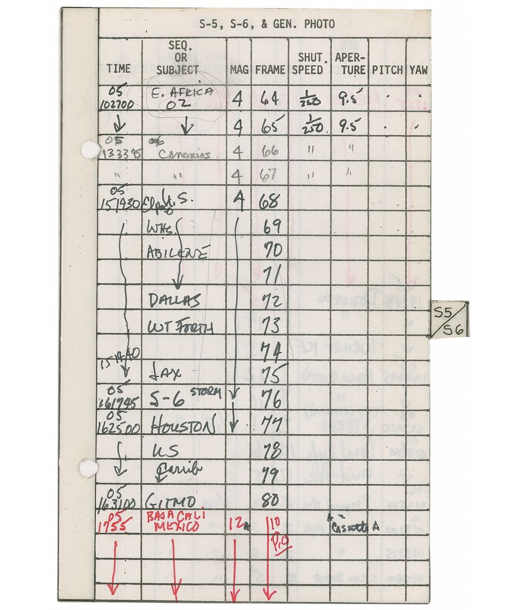 The pages contain the detailed remarks of the crew, including those on pages subtitled “Experiments Log Sheet,” “Inflight Copy Sheet,” and “Cabin Lighting Survey.” Page upon page, about half of the book, is filled with concise abbreviations and numerical values, each note explaining the time of an experiment, the sequence and mode numbers, and any remarks (most often in the form of degree notations). Other detailed notations include “Left roll only with roll logic switch in pitch—no right yaw” and “Right yaw only with roll logic switch in yaw no left roll.” Other handwritten comments are quite remarkable. Under a section titled “01-00-00 Cooper/Conrad Vision Test” Conrad has written such notations as “18-34-38 Laredo Sighting. DID NOT SEE IT,” “18 25 05 Gordo Saw Targets—I didn’t, sorry about that!,” “03 13+32+46 Saw smoke, no targets, bad sun angle,” and “07160040 Saw smoke saw targets. On Gordo’s side he scored 4 & 1 in the first two boxes. Window measurements made.”