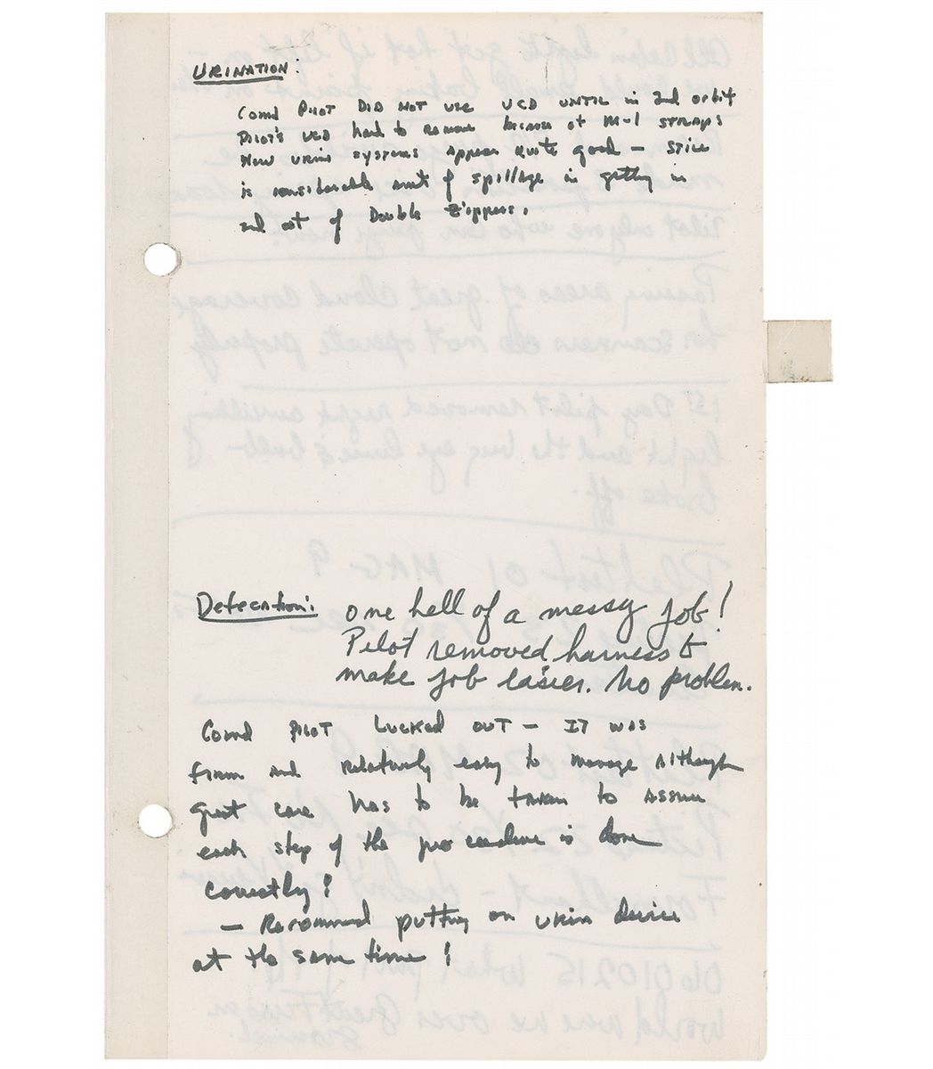 Other noteworthy comments include “Blood pressure/cuff fitting leaded at suit, repaired by using screwdriver in post landing kit,” “CMD Pilot Asleep. Drifting” [though the crew would later report having had trouble sleeping in alternate sleep periods], and a detailed description of using the restroom in weightless conditions. Cooper has noted, “Urination Comd Pilot did not use UCD until in 2nd orbit. Pilot’s UCD had to remove because of M-1 straps. New urine system appears quite good—still is considerable amt of spillage in getting in and out of double zipper.” At the bottom of the same page Conrad wrote: “Defecation: one hell of a messy job! Pilot removed harness to make job easier. No problem.” Cooper added, “Comd pilot lucked out—It was firm and relatively easy to manage although great care has to be taken to assure each step of the procedure is done correctly! Recommend putting on urine device at the same time!”