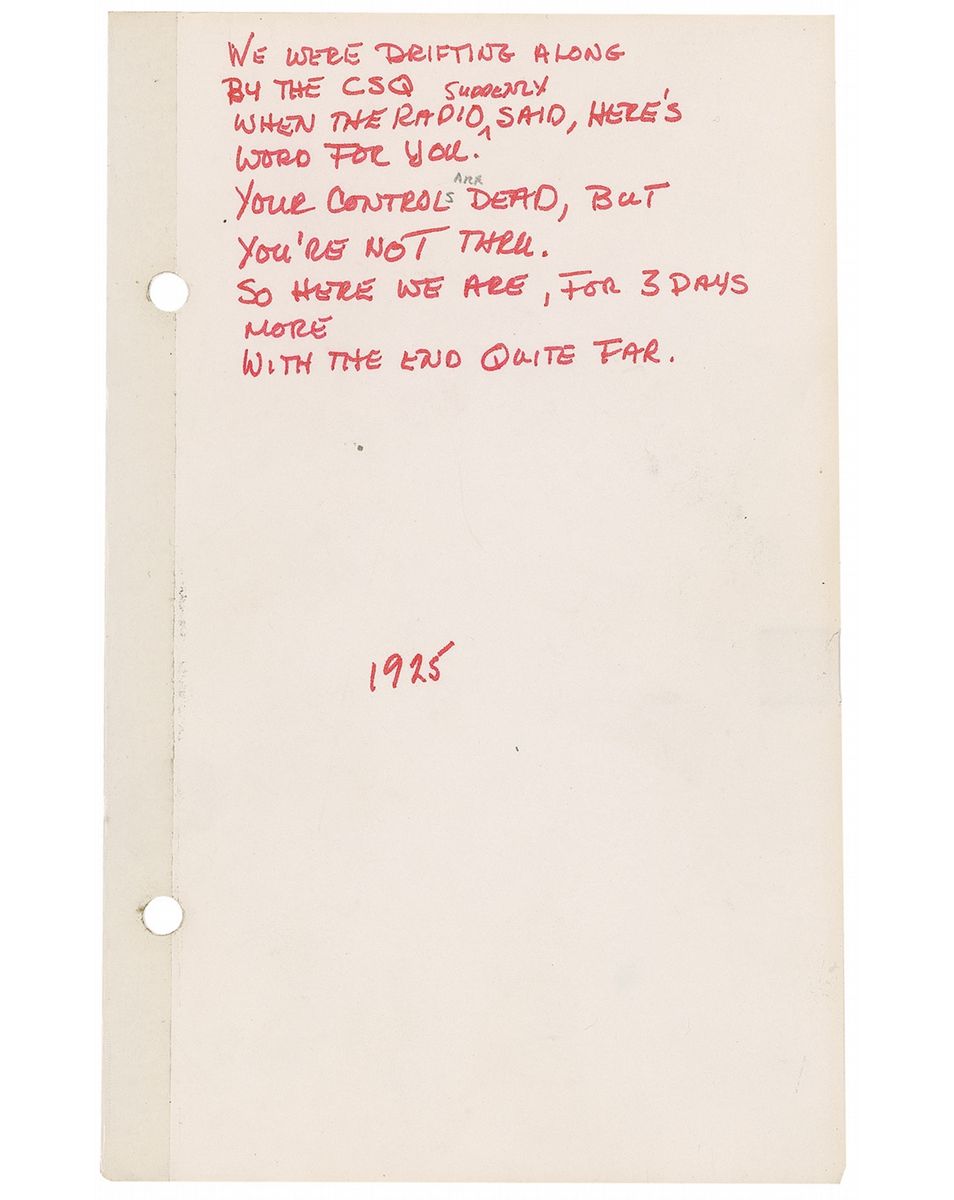 The very last page bears the quotation, “We were drifting along by the CSQ when the radio suddenly said, here’s word for your. Your controls are dead, but you’re not thru. So here we are, for 3 days more with the end quite far.” The words were actually a song, sung to the melody of ‘Moonlight Bay,’ that Conrad and Cooper had created in flight to amuse mission control—and themselves. The ditty was penned after Coastal Sentry Quebec said the ship might have to drift for three days in space, but never performed as, the astronauts later reported, ‘we got busy again.’
