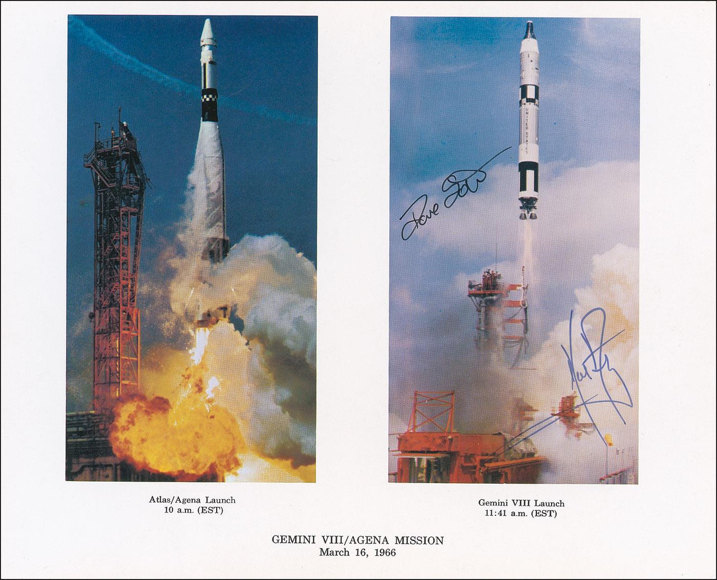 Scarce and desirable color 10 x 8 NASA composite photo of the liftoff of the Atlas/Agena and the Gemini 8 rockets, signed in blue felt tip by Neil Armstrong and Dave Scott. In very fine condition. A seldom-seen combination of two tough signers!
