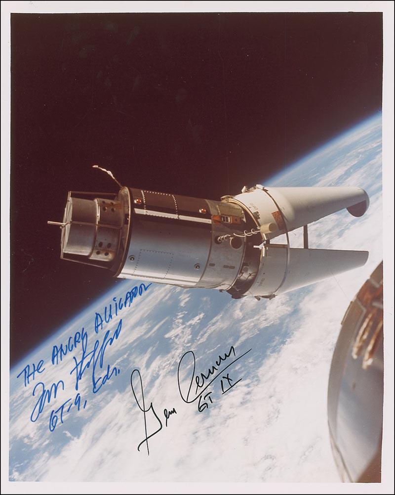 Spectacular color satin-finish 8 x 10 photo taken during the Gemini 9 mission, signed in blue felt tip, “The angry alligator, Tom Stafford GT-9 cdr,” and in black felt tip, “Gene Cernan, GT IX.” In very fine condition.