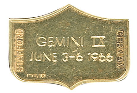 Flight-flown silver plated Fliteline medallion, approximately 1 x .75, flown aboard the Gemini IX mission. One side bears a raised insignia of the mission, with reverse engraved “Gemini IX, June 3–6, 1966,” with the crew members names vertically to each edge. In fine condition, with expected light wear. Accompanied by a 2007 certificate of authenticity from Joseph Kerwin, stating “As a member of the Astronaut Flight Office I had the privilege of purchasing a flown medal for this mission. This medal is from my personal collection and has been in my possession since receiving it just after the mission.”