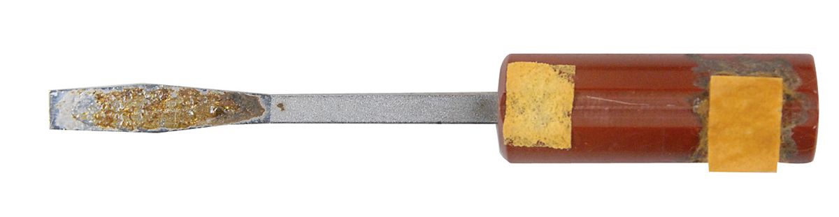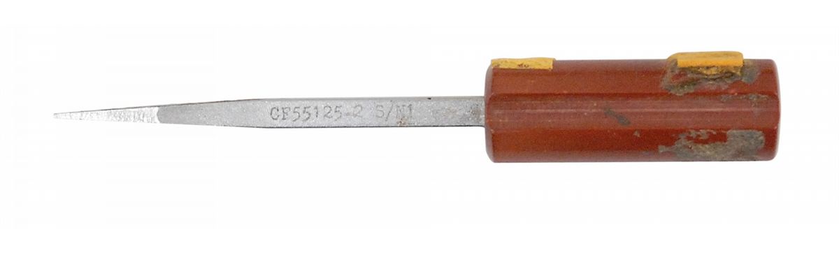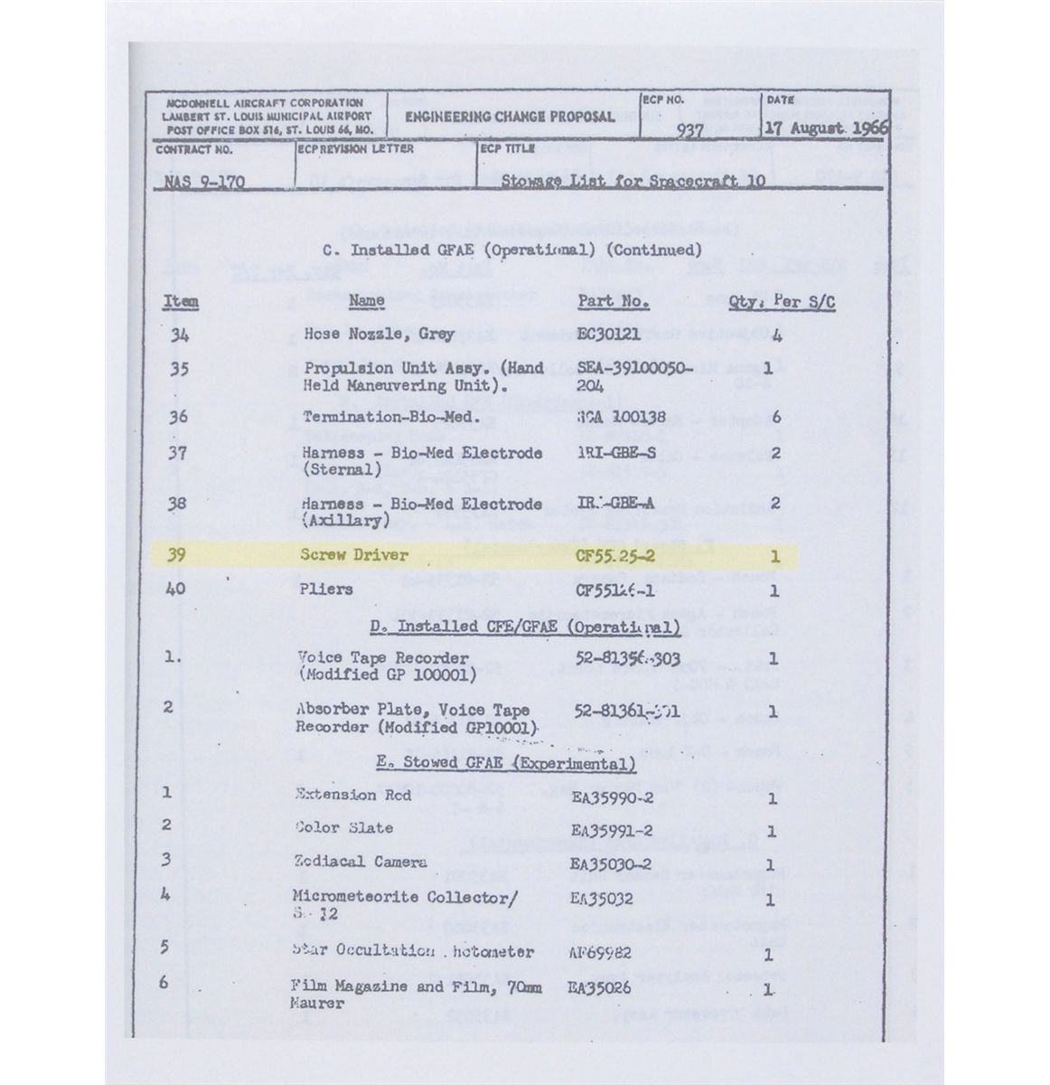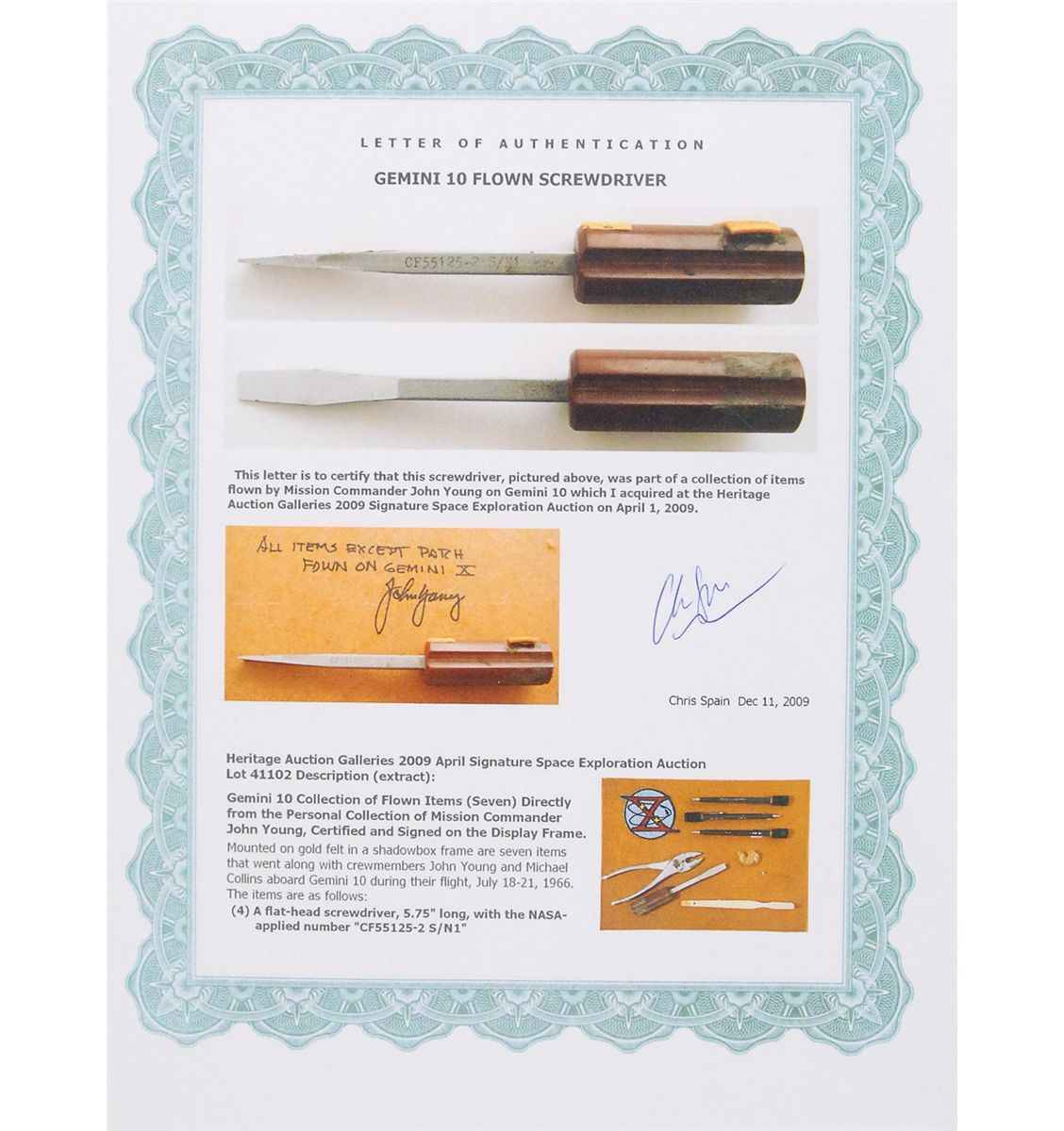 Flown screwdriver, measuring 5.75” long, used by John Young on Gemini 10. Flat-headed screwdriver is labeled by NASA, “CF55125–2 S/N1,” on one side of the blade. Accompanied by a 2009 letter of authenticity from Chris Spain, reading in part: “This letter is to certify that this screwdriver, pictured above, was part of a collection of items flown by Mission Commander John Young on Gemini 10 which I acquired at the Heritage Auction Galleries 2009 Signature Space Exploration Auction on April 1, 2009 [lot 41102].” Also included is a copy of the Gemini 10 stowage list confirming this item as “Item 39, Screw Driver, CF55125-2.” Please note: a document reproduction error obstructed the complete character “1,” so that it appears as a "." versus a "1." In very good to fine condition, consistent with mission use, with two pieces of Velcro to handle, and adhesive residue to one side on the metal shaft. Flown Gemini pieces are notoriously difficult to acquire and positively identify. This screwdriver, profiled on the well-respected research website Space Flown Artifacts, is a wonderful exception. With the incontrovertible evidence recorded on the stowage list, this piece is confirmed as the only screwdriver taken aboard Gemini 10.