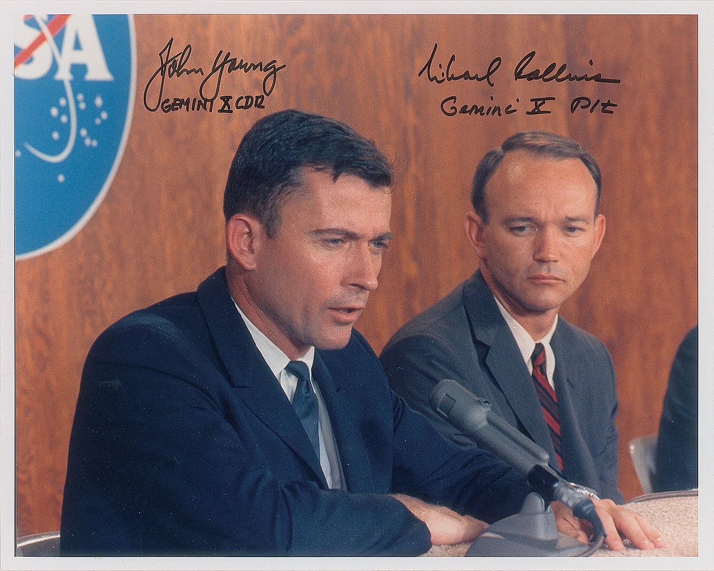 Color satin-finish 10 x 8 photo of the Gemini 10 crew during a press conference, signed in black felt tip, "John Young, Gemini X CDR" and "Michael Collins, Gemini X Plt." In very fine condition. Accompanied by certificates of authenticity from Novaspace.