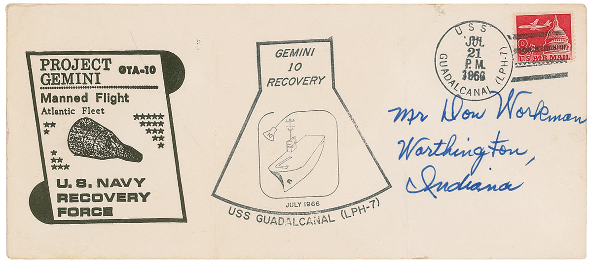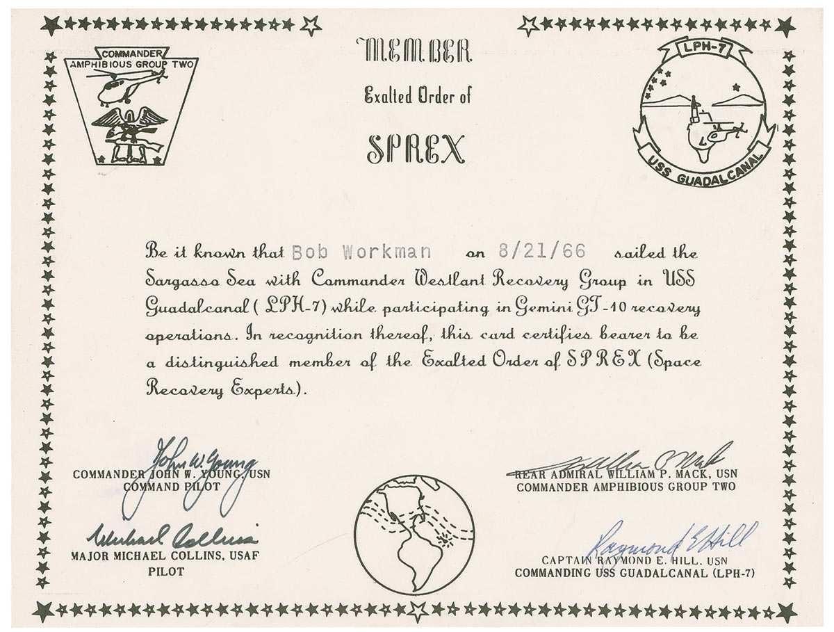 DS, signed in black felt tip, “John W. Young” and “Michael Collins,” one page, 10.5 x 8. In full: “Be it known that Bob Workman on 8/21/66 sailed the Sargasso Sea with Commander Westland Recovery Group in USS Guadalcanal (LPH-7) while participating in Gemini GT-10 recovery operations. In recognition thereof, this card certifies bearer to be a distinguished member of the Exalted Order of SPREX (Space Recovery Experts).” Also signed by the vessel’s commanding officer and the commander of Amphibious Group Two. In fine condition. Accompanied by a souvenir cover postmarked on the USS Guadalcanal. Quite uncommon to see items signed by astronauts so soon after splashdown and recovery.