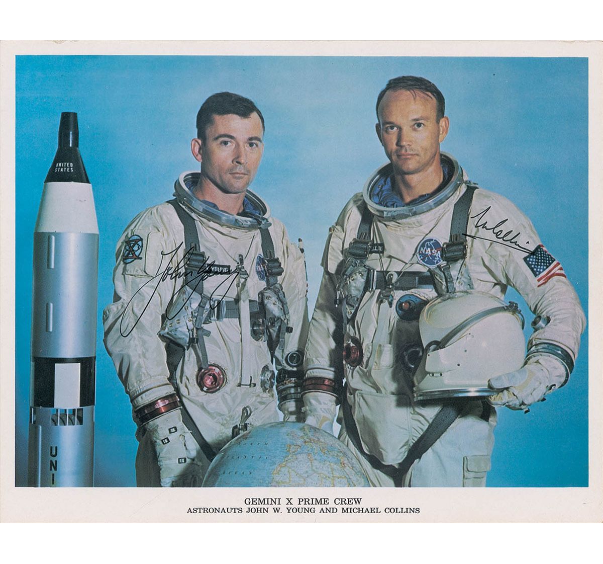 Uncommon color 10 x 8 NASA photo of the Gemini X crew posing in their spacesuits, signed in black felt tip by John Young and Michael Collins. In fine condition, with a few dings along the top edge.