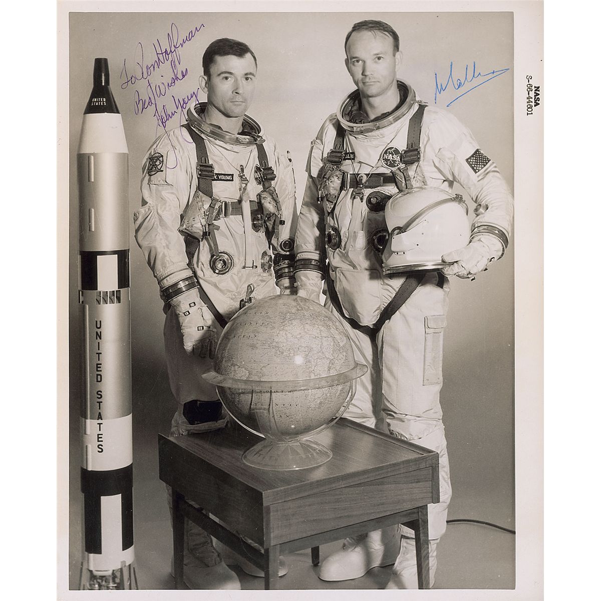 Uncommon glossy 8 x 10 NASA photo of the Gemini 10 crew posing in their spacesuits with a globe and model of their rocket, signed and inscribed in black felt tip “To Ron Hoffman, Best wishes, John Young,” and signed in blue ballpoint by Michael Collins. In fine condition.