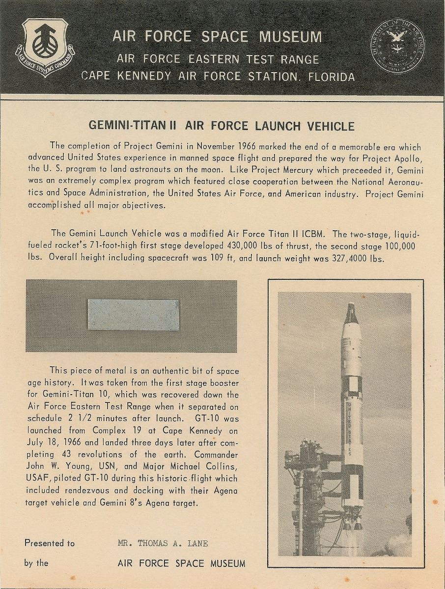 Flown metal fragment from the Gemini-Titan 10 first stage booster, approximately 1.5 x .5, affixed to a 7.5 x 10 Air Force Space Museum sheet presented to Thomas A. Lane. The sheet features an image of the GT-10 rocket launch, background information on the Gemini-Titan II Air Force Launch Vehicle, and states that the fragment “was recovered down the Air Force Eastern Test Range when [the first stage booster] separated on schedule 2 1/2 minutes after launch.” In fine condition, with a mounting strip to top back edge. As a fragment bestowed to an important figure during the flagship days of NASA, this artifact represents an especially appealing piece of space history, and only the second time that we have offered a fragment from a Gemini-Titan booster.