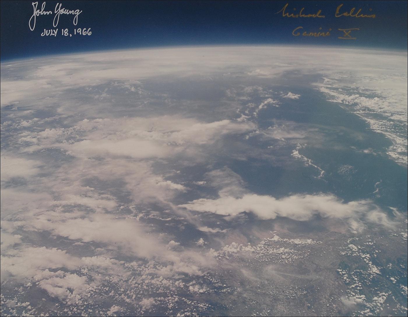 Color 13.75 x 10.75 photo of the Earth taken during the Gemini 10 mission, signed in silver ink, “John Young, July 18, 1966,” and in gold ink, “Michael Collins, Gemini X.” Matted to an overall size of 20 x 16. In fine condition. A scarce opportunity to obtain a full crew photo.