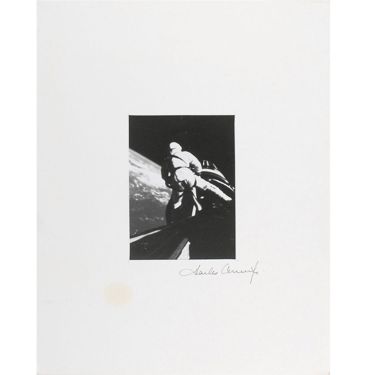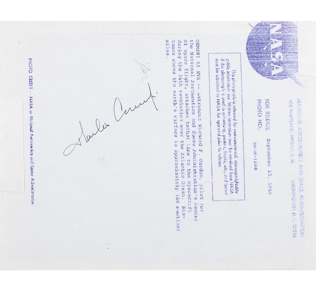 Glossy 8 x 10 NASA photo of Charles Conrad performing his spacewalk during the Gemini 11 mission, matted to an overall size of 11 x 14, signed on the mount in black ink, “Charles Conrad, Jr.,” and signed again on the reverse. In fine condition, with a small spot of light toning to mat. Provenance: Superior Auction, Fall 1998.