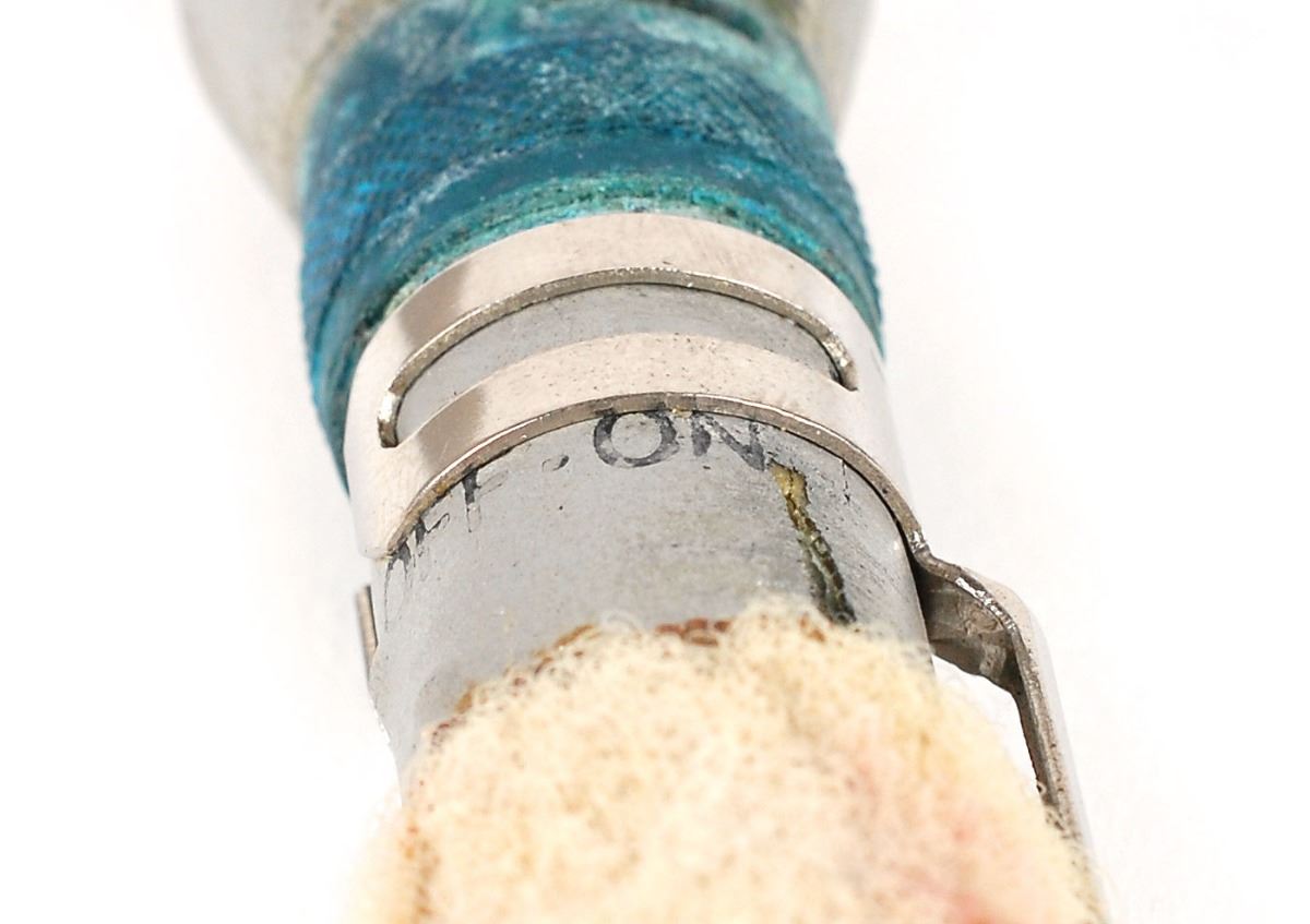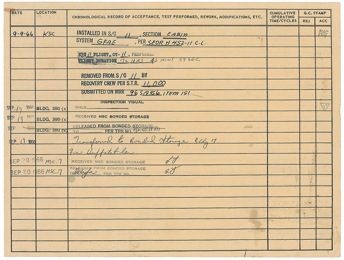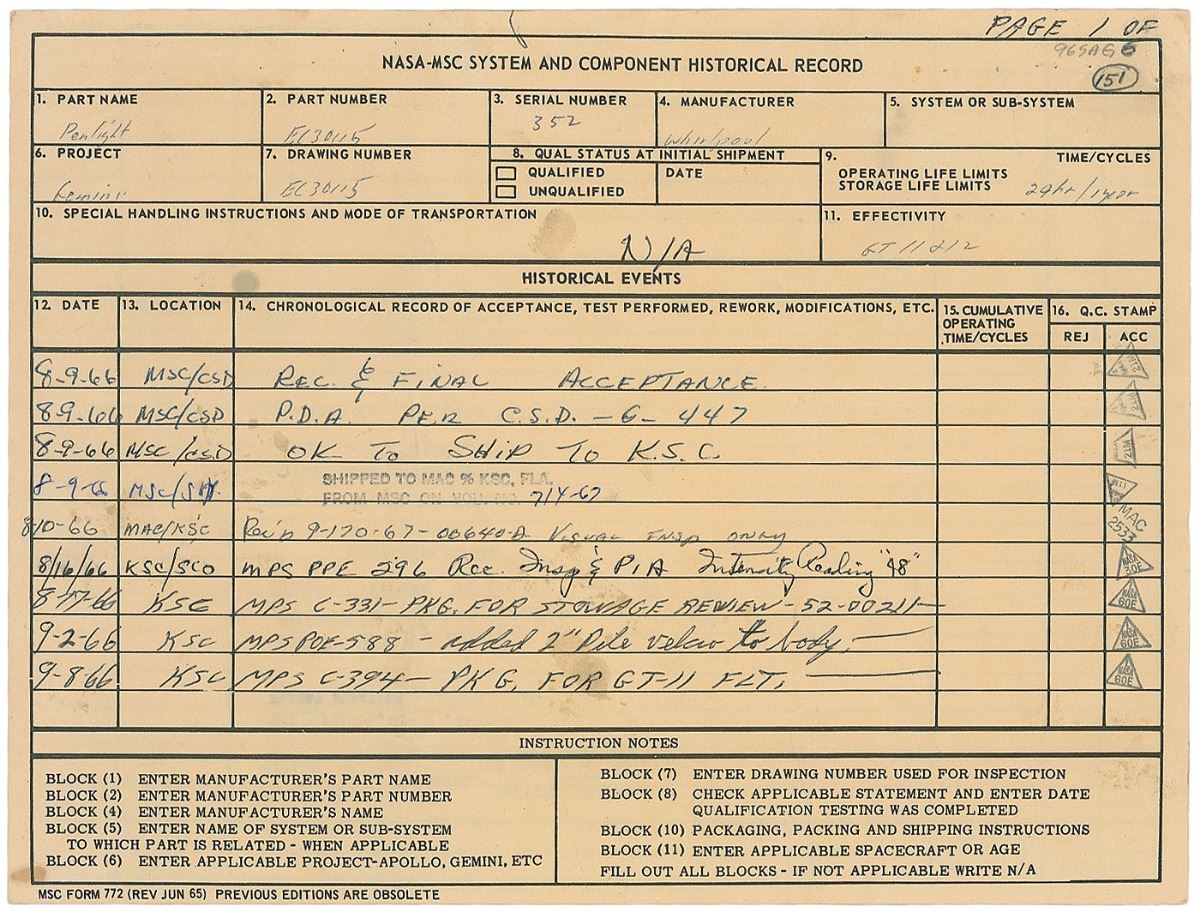 Flown penlight carried on the Gemini 11 mission manufactured by Whirlpool, measuring approximately 5.5? long, with the body wrapped in Velcro and bearing indecipherable red notations. Includes its NASA-MSC System and Component Historical Record sheet that traces the complete history and use of the penlight, noting its shipment from the Manned Spacecraft Center to the Kennedy Space Center in August 1966, the addition of Velcro to the body, preparation, and eventual flight. The entry on September 9, 1966, reads: "Installed in S/C 11, Section Cabin, System GFAE, Per SEDR H 452-11 C. L." The next entry gives its flight history: "S/C 11, Flight GT-11, Performed, Flight Duration 72 Hrs 42 Mins 59 Sec." In very good condition, with expected wear, overall soiling, and a rather pungent odor emanating from the flashlight; and scattered stains and creases to the component record sheet. A desirable and infrequently seen piece of flown Gemini equipment. The Leon Ford Collection.