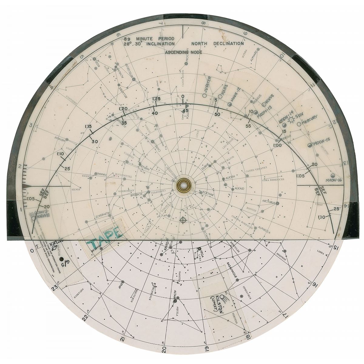 Flown rotating circular star chart carried on the Gemini 11 mission, 9.5? in diameter, depicting the constellations seen at launch and with several affixed pieces of tape bearing handwritten notations identifying other celestial bodies. In fine condition. Accompanied two certificates of authenticity from Richard Gordon, one typed and one handwritten in pencil. The latter, in full: “Star chart used on Gemini XI launch on 9/12/66 at an inclination of 28° 30'.”