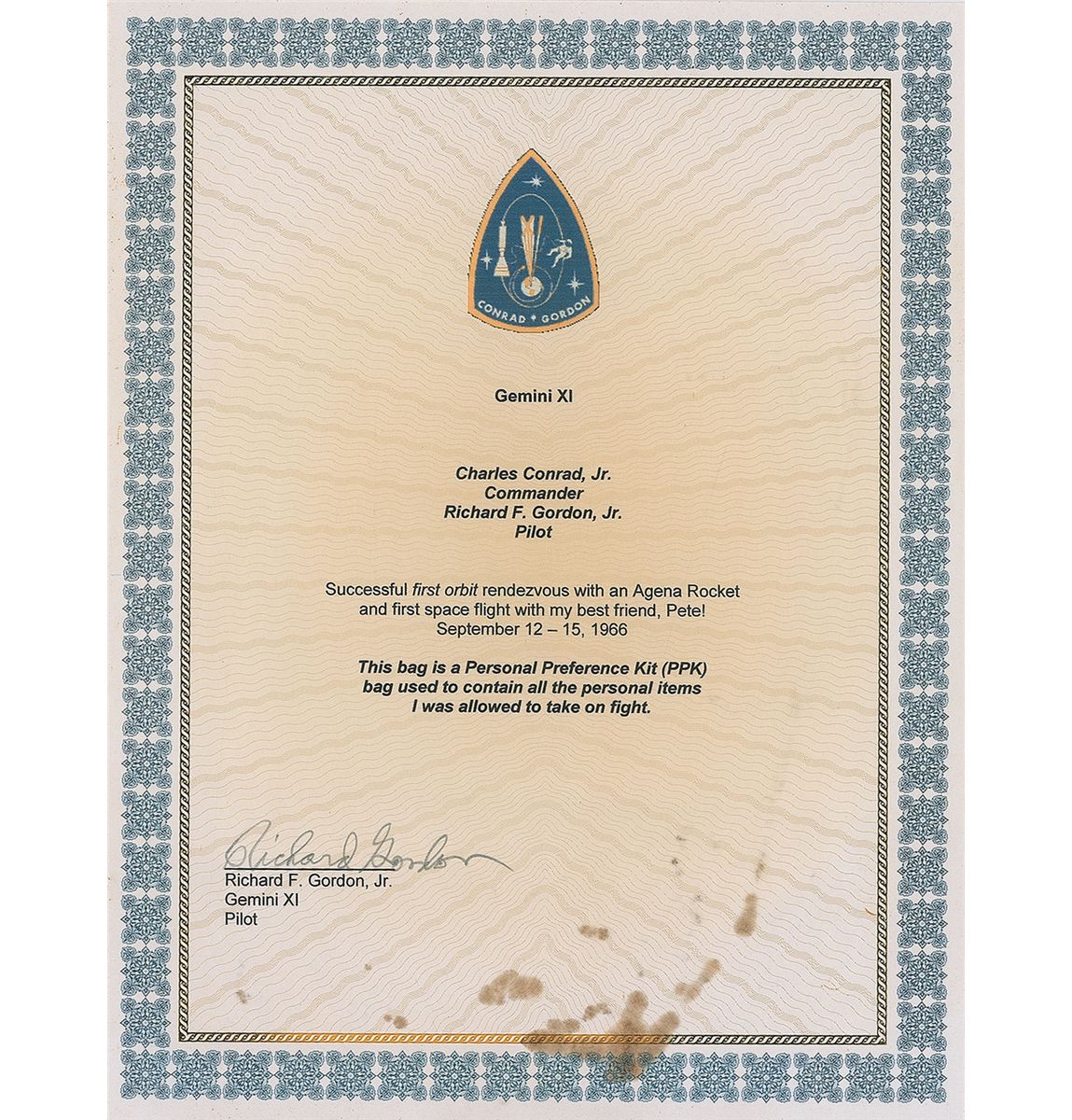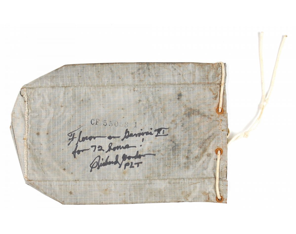 Richard Gordon’s flown PPK bag carried into earth orbit on the Gemini 11 mission. Nylon bag measures 9 x 5.75 and has metal grommets along the opening and a nylon cord closure. One side of the bag is stamped, “CF550531,” and is signed in black felt tip, “Flown on Gemini XI for 72 hours! Richard Gordon PLT.” Accompanied by a certificate of authenticity from Gordon, which reads, in part: “This bag is a Personal Preference Kit (PPK) [and] was used to contain all the personal items I was allowed to take on flight.” In very good condition, with scattered staining and moderate rigidity. This artifact was exposed to the vacuum of space during Gordon's two EVAs. With only one PPK bag issued to each Gemini astronaut, there are only 20 flown examples in existence, and only three others have been offered at auction.