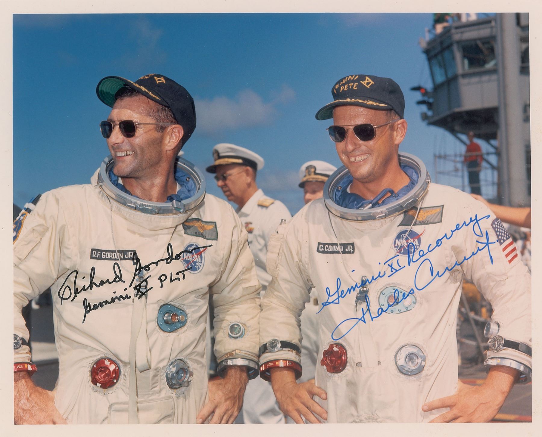 Color semi-glossy 10 x 8 photo of the crew of the Gemini 11 mission standing proudly on the deck of the USS Guam recovery ship, signed in black felt tip, "Richard Gordon, Gemini XI PLT," and in blue felt tip, "Gemini XI Recovery, Charles Conrad, Jr." Reverse of photo bears an affixed label from The Spacesource. In fine condition.