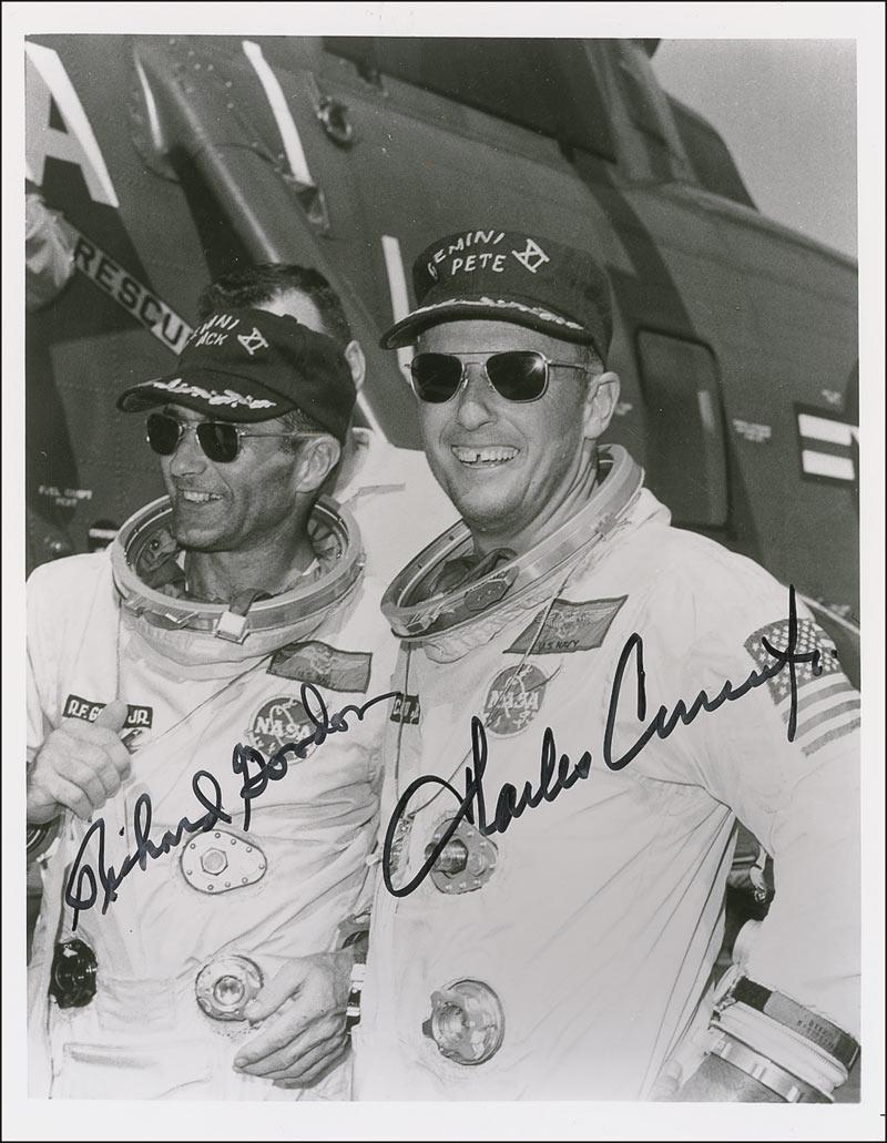 Glossy 8 x 10 photo of the Gemini 11 crew smiling after arriving on the carrier deck after their mission, signed in black felt tip by Richard Gordon and Charles Conrad. In fine condition, with a few dings and creases along top edge.
