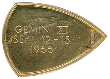 Flight-flown Fliteline medal, gold over sterling, measuring approximately 1 x .75, originally belonging to astronaut Charlie Duke, who was a member of the Mission Control Team for Gemini 11 monitoring the booster systems. One side bears a raised image of the mission insignia, with the other side engraved “Gemini XI, Sept. 12–15, 1966,” and was flown aboard the Gemini 11 capsule. Accompanied by a certificate of authenticity from Duke, stating this medallion “is from my personal collection of space artifacts and has been in my possession since receiving it shortly after the mission…As a member of the Astronaut Office, I was permitted to purchase a medal from all of the missions.” In fine condition, with expected light wear.