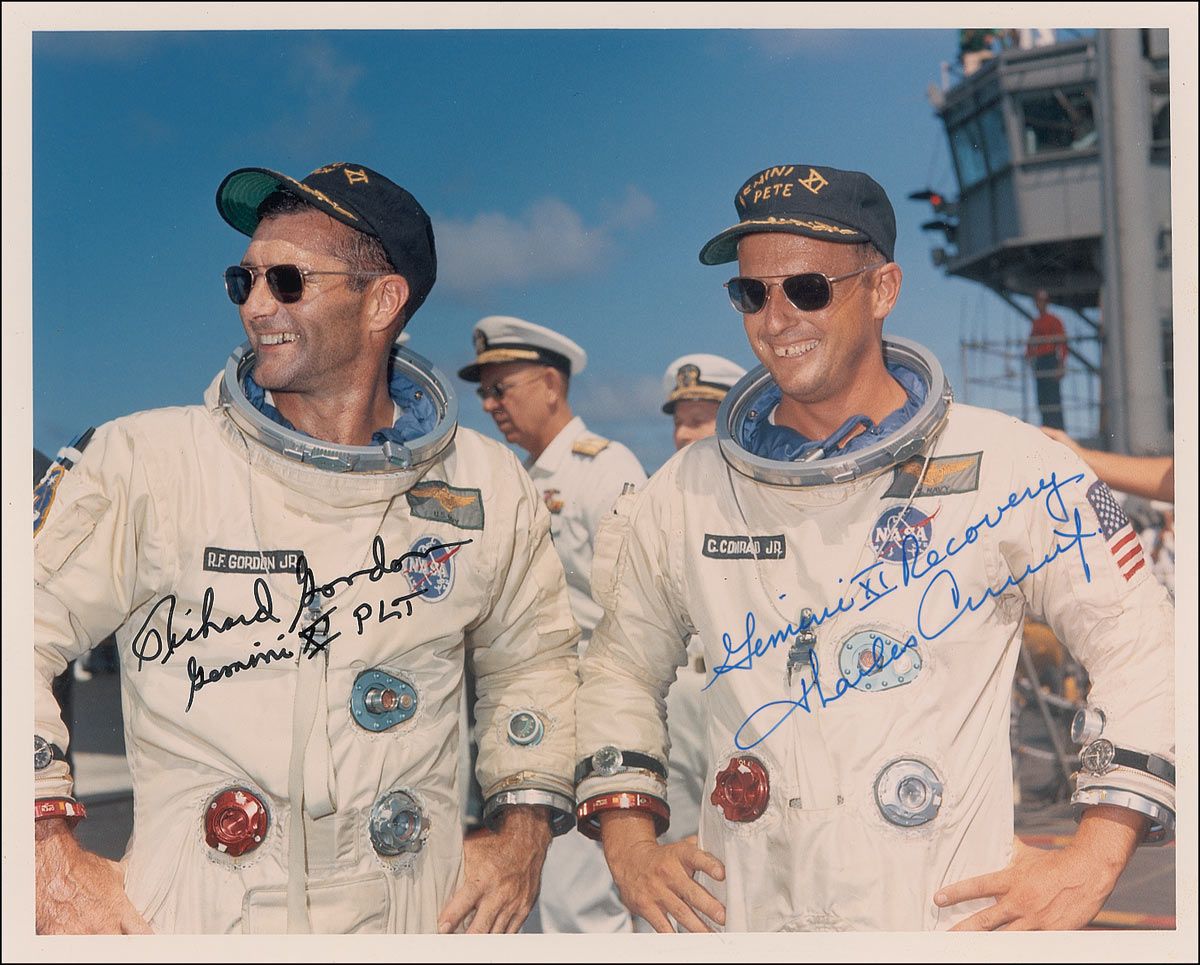 Color satin-finish 10 x 8 photo of Gordon and Conrad in their white spacesuits and sunglasses after the recovery, signed in black felt tip, “Richard Gordon, Gemini XI PLT” and in blue felt tip, “Gemini XI Recovery, Charles Conrad.” In fine condition, with a trivial crease to the top right corner.