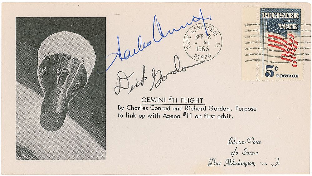 Commemorative cover with a cachet honoring the Gemini 11 flight, signed in blue ballpoint by Charles Conrad and in black ballpoint by Dick Gordon. In fine condition.