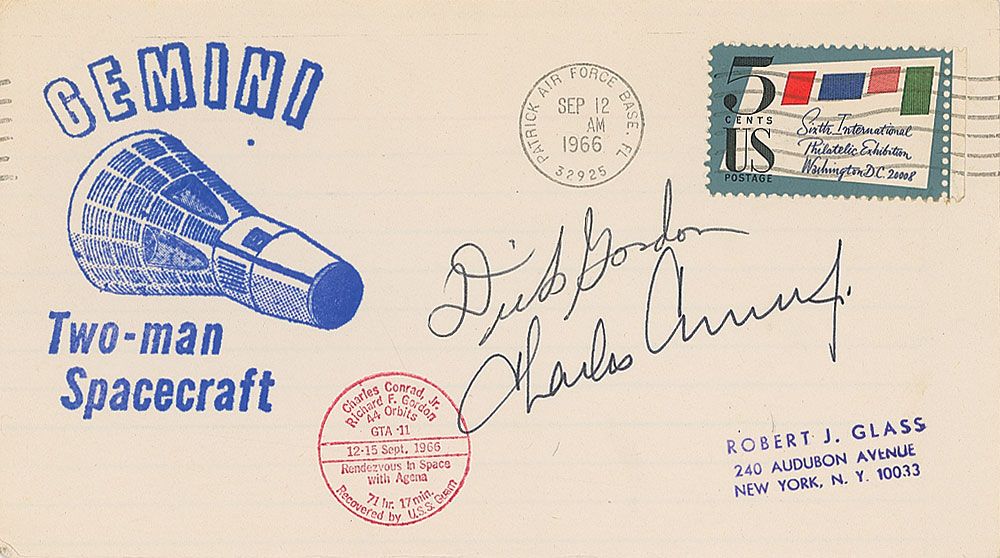 Commemorative cover with a cachet honoring the Gemini 11 spacecraft and mission, signed in black ink by Dick Gordon and Charles Conrad. In fine condition, with a stamped address to lower right.