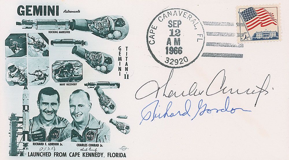 Gemini 11 launch date postal cover with a cachet honoring honoring the astronauts and their mission, signed in black ballpoint by Charles Conrad and in blue ballpoint by Richard Gordon. In fine condition.