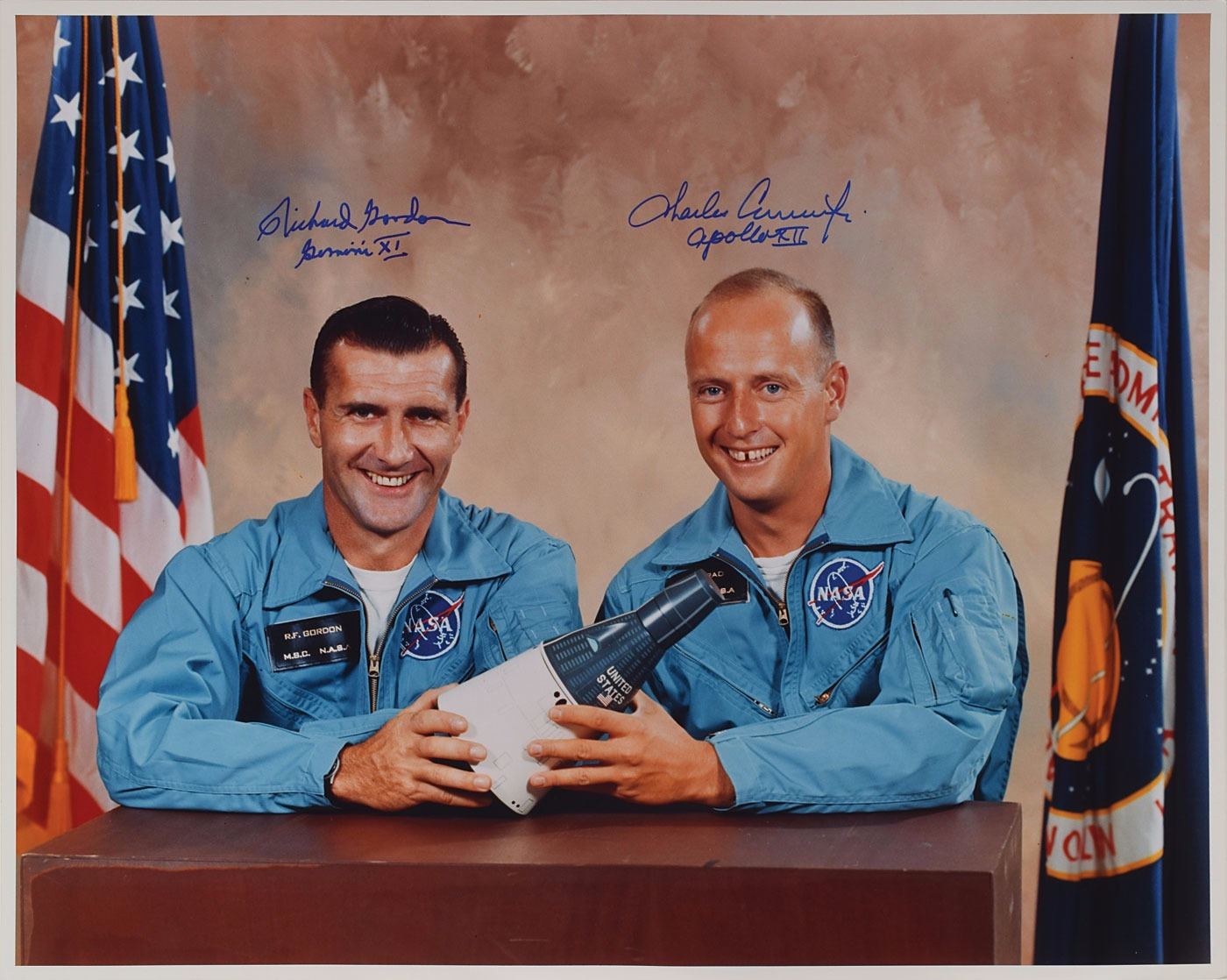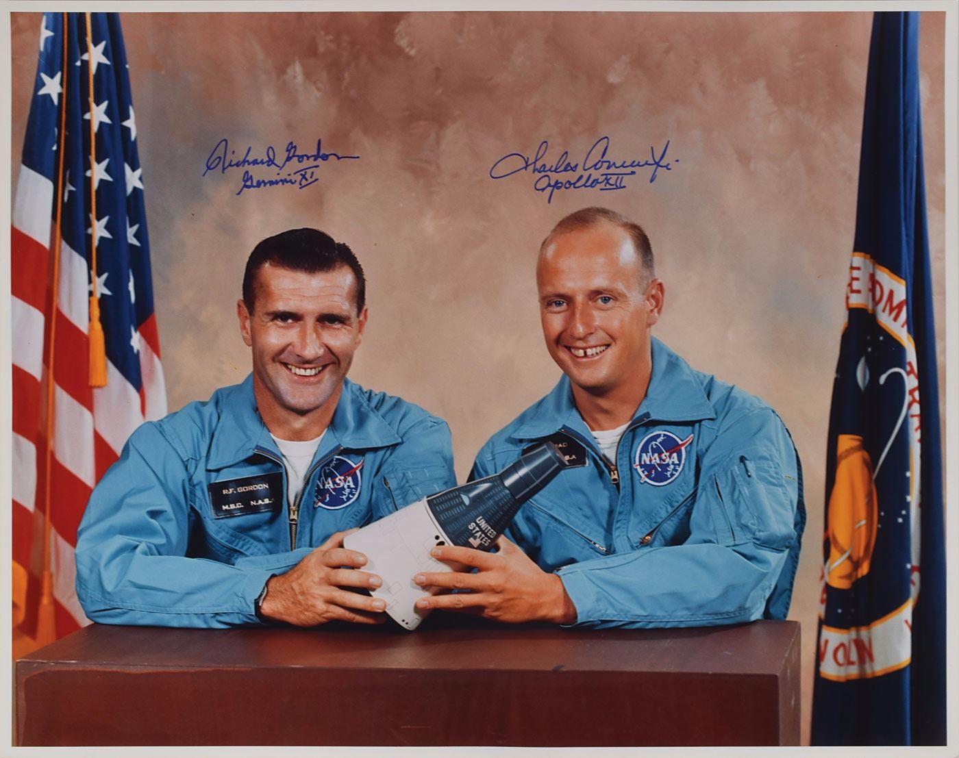 Identical set of four color semi-glossy 20 x 16 photos of the Gemini 11 crew wearing their blue training suits and holding a model of a capsule, each signed in blue felt tip, "Richard Gordon, Gemini XI" and "Charles Conrad, Jr., Apollo XII." In overall fine condition.