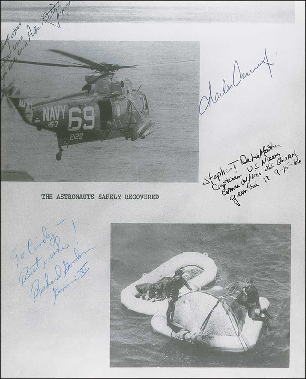 Glossy 8 x 10 photo of the recovery, signed and inscribed in blue ballpoint by Richard Gordon, “To Cindy, Best wishes! Richard Gordon, Gemini XI” and Charles Conrad. Also signed by the captain of the USS Guam and a member of the recovery team. In fine condition, with some light creasing to bottom corners.