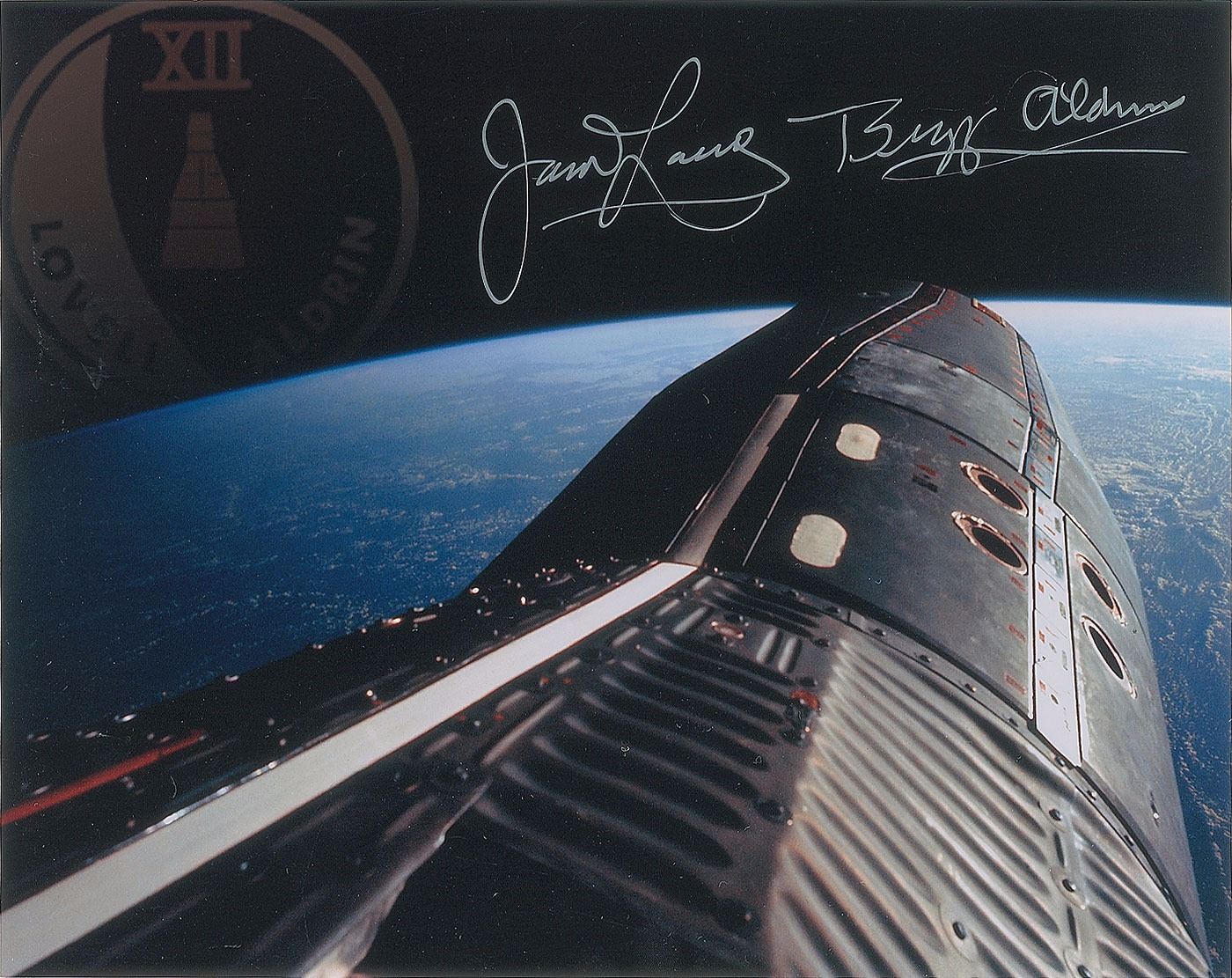 Fantastic color semi-glossy 10 x 8 photo of a Gemini capsule soaring high above planet Earth, with a faint Gemini XII mission logo in the upper left, signed in silver ink by James Lovell and Buzz Aldrin. In fine condition.