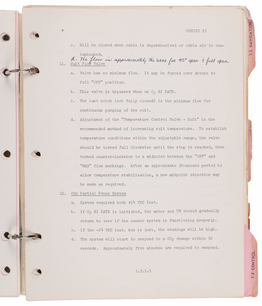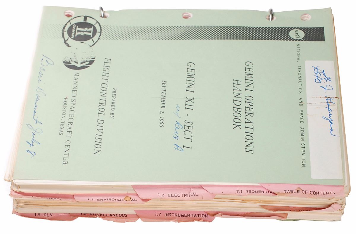 Two Gemini 12 manuals personally-owned and -used by deputy launch director Walter Kapryan. First is his manual entitled “Gemini Operations Handbook, Gemini XII—Sect 1,” to which he has added “w/ Revs A.” Several pages bear notations in Kapryan’s hand, with a couple including: “The flow is approximately the same for 95º open & full open” and “Revision A: Delete ‘RES and OAMS reserve TNK Press’ from ‘OAMS and RCS Press. and Temp. select.” He also strikes through several lines throughout and makes slight revisions to various numbers and measurements. Second is his copy of the final version of the Gemini Operations Handbook, entitled “Section III: Operation Procedures,” not including any annotations inside. Both are housed in modern three-ring binders. In overall fine condition. The Leon Ford Collection.