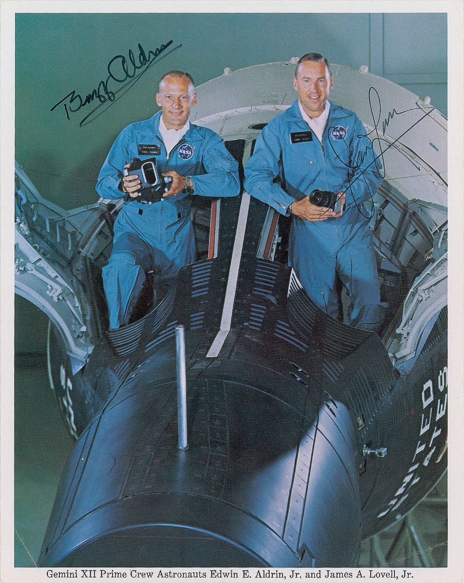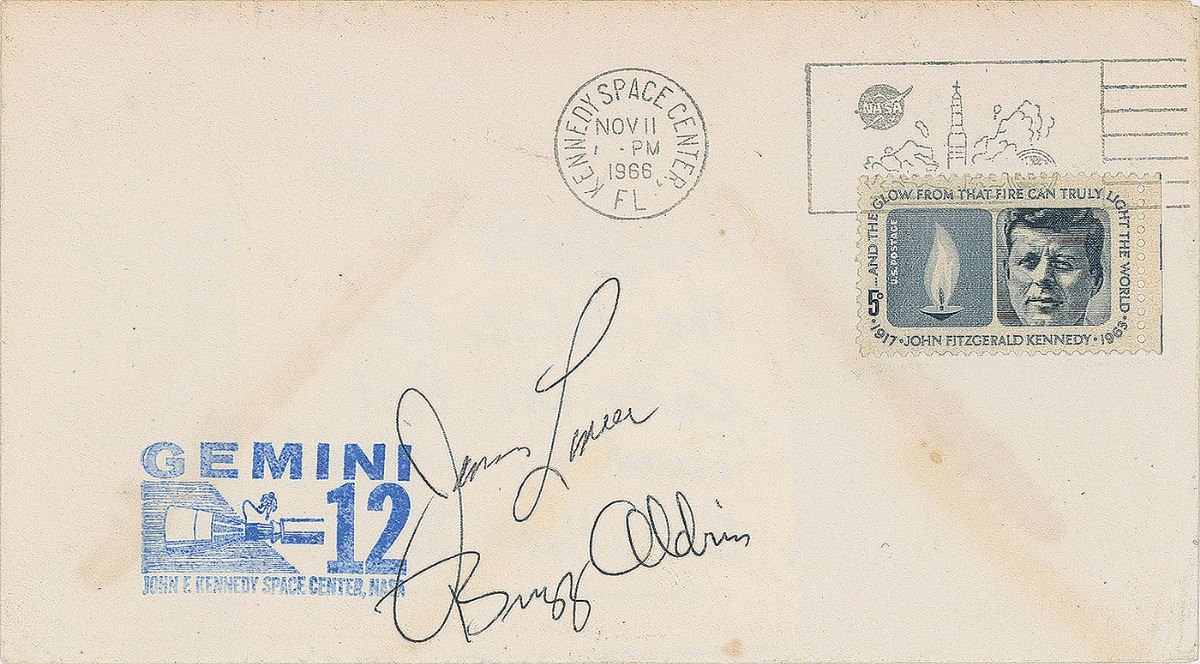 Two items: a Gemini 12 launch day cover with a stamped cachet honoring the mission, signed in black ballpoint by Buzz Aldrin and James Lovell; and an official color 8 x 10 NASA lithograph of the Gemini 12 prime crew with their capsule, signed in black felt tip by both Aldrin and Lovell. In overall very good to fine condition, with toning from the envelope adhesive to the cover and creases to lower corners of the lithograph. Consignor notes that the cover originates from the collection of astronaut Edward H. White III. From the collection of aerospace memorabilia specialist Ken Havekotte.