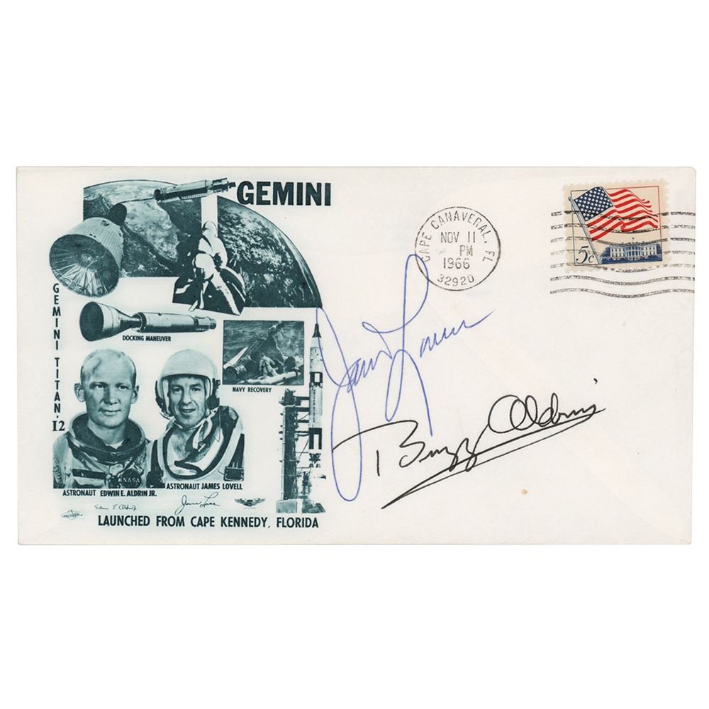 Commemorative ‰Û÷launch day‰Ûª cover with a cachet honoring the Gemini 12 mission, postmarked at Cape Canaveral on November 11, 1966, the date of liftoff, signed neatly in black ink by Buzz Aldrin and in blue ballpoint by James Lovell. In fine condition. Accompanied by a full letter of authenticity from Zarelli Space Authentication.