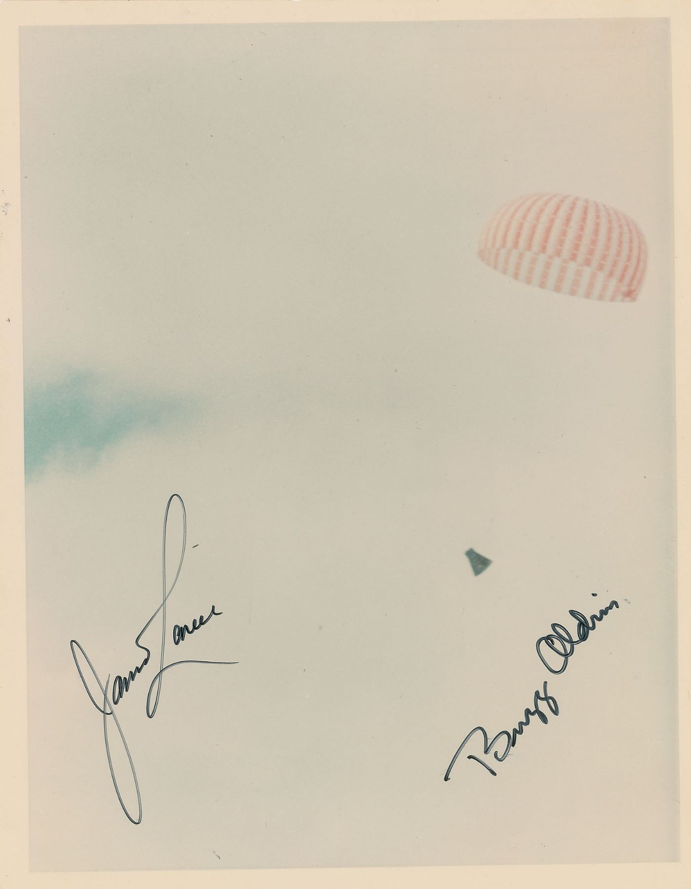 Uncommon color glossy 8.5 x 11 photo of the Gemini 12 capsule parachuting its way to the Atlantic for its eventual recovery by the USS Wasp on November 15, 1966, signed in black felt tip by James Lovell and Buzz Aldrin. Reverse bears a McDonnell Aircraft Corporation stamp and "A Kodak Paper" watermarks. In fine condition, with a light surface crease at the top.
