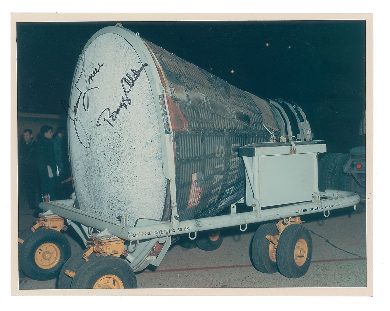 Unusual color glossy 11 x 8.5 photo of the Gemini 12 capsule being transported following its three-day mission, signed in black felt tip by James Lovell and Buzz Aldrin. Reverse bears a McDonnell Aircraft Corporation stamp and "A Kodak Paper" watermarks. In fine condition, with small creases to the upper right corner tip.