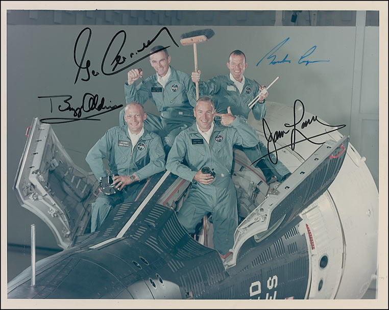 Lighthearted color glossy 10 x 8 double weight photo of the Gemini 12 primary and backup crews posing together in their capsule, with Buzz Aldrin and James Lovell holding their photographic equipment, and Gene Cernan and Gordon Cooper holding pipes, a push broom and a slide ruler, signed in black felt tip by Aldrin, Lovell, and Cernan, and in blue felt tip by Cooper. In fine condition, with a few scattered light creases.