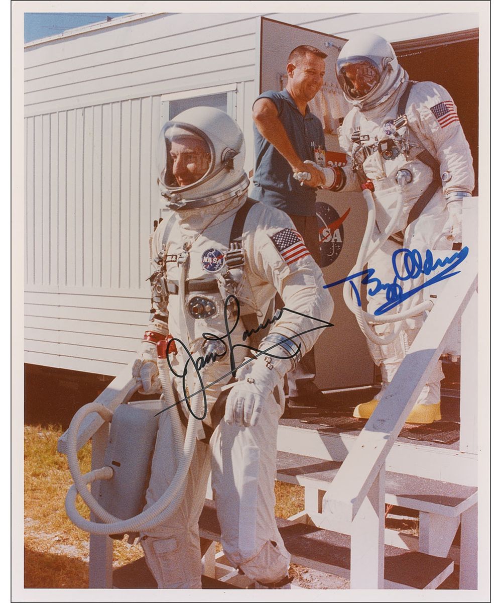 Flawless color satin-finish 8 x 10 photo of Buzz Aldrin and Jim Lovell in their white spacesuits descending from a trailer, signed in blue felt tip by Aldrin and black felt tip by Lovell. In very fine condition.