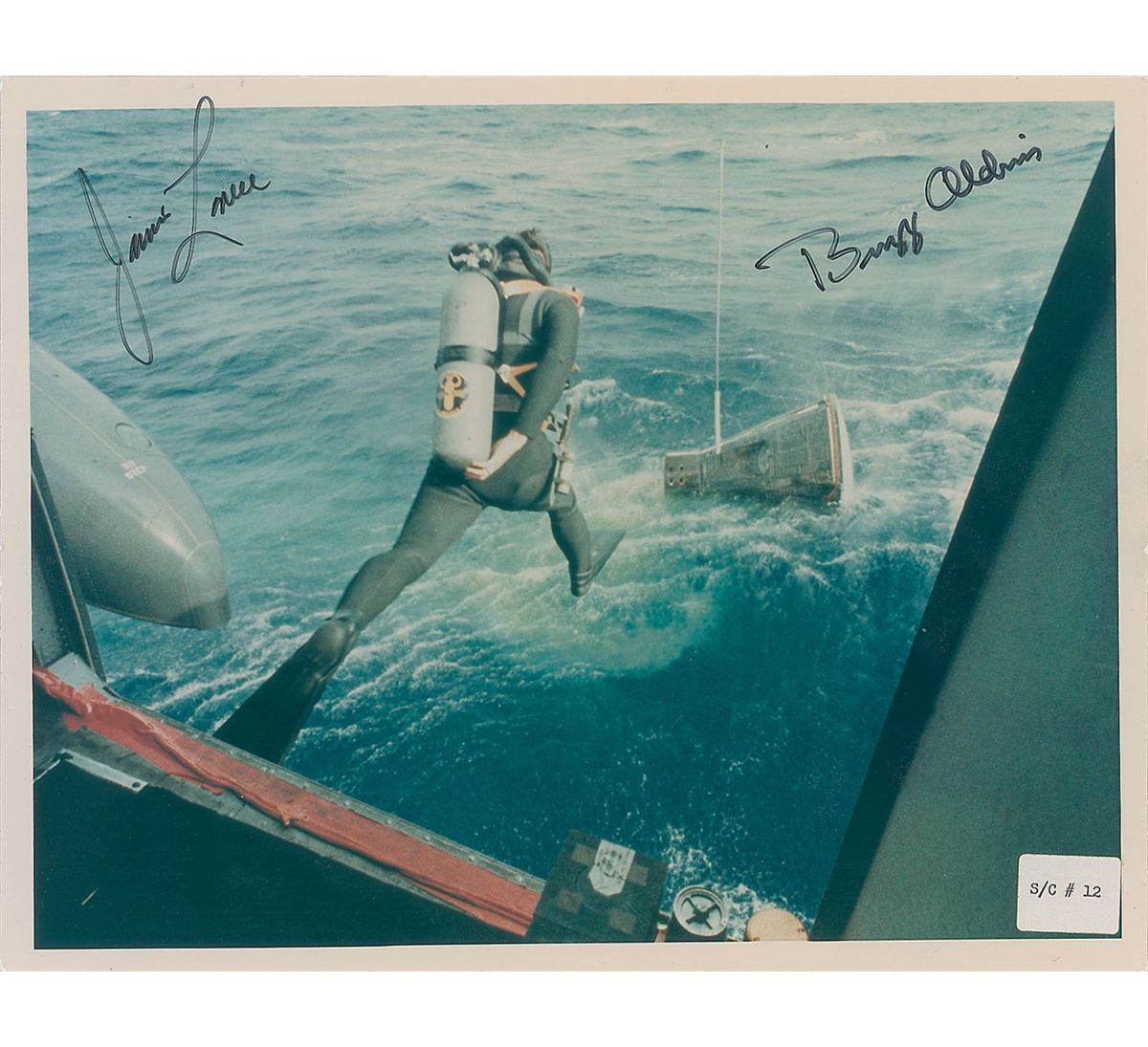 Color glossy 11 x 8.5 double–weight McDonnell Aircraft Corporation photo of a diver jumping into the Atlantic during recovery of the Gemini 12 capsule, signed in black felt tip by James Lovell and Buzz Aldrin. In fine condition, with trivial creasing and surface impressions, and a label affixed to lower right corner. From the Leon Ford Collection.
