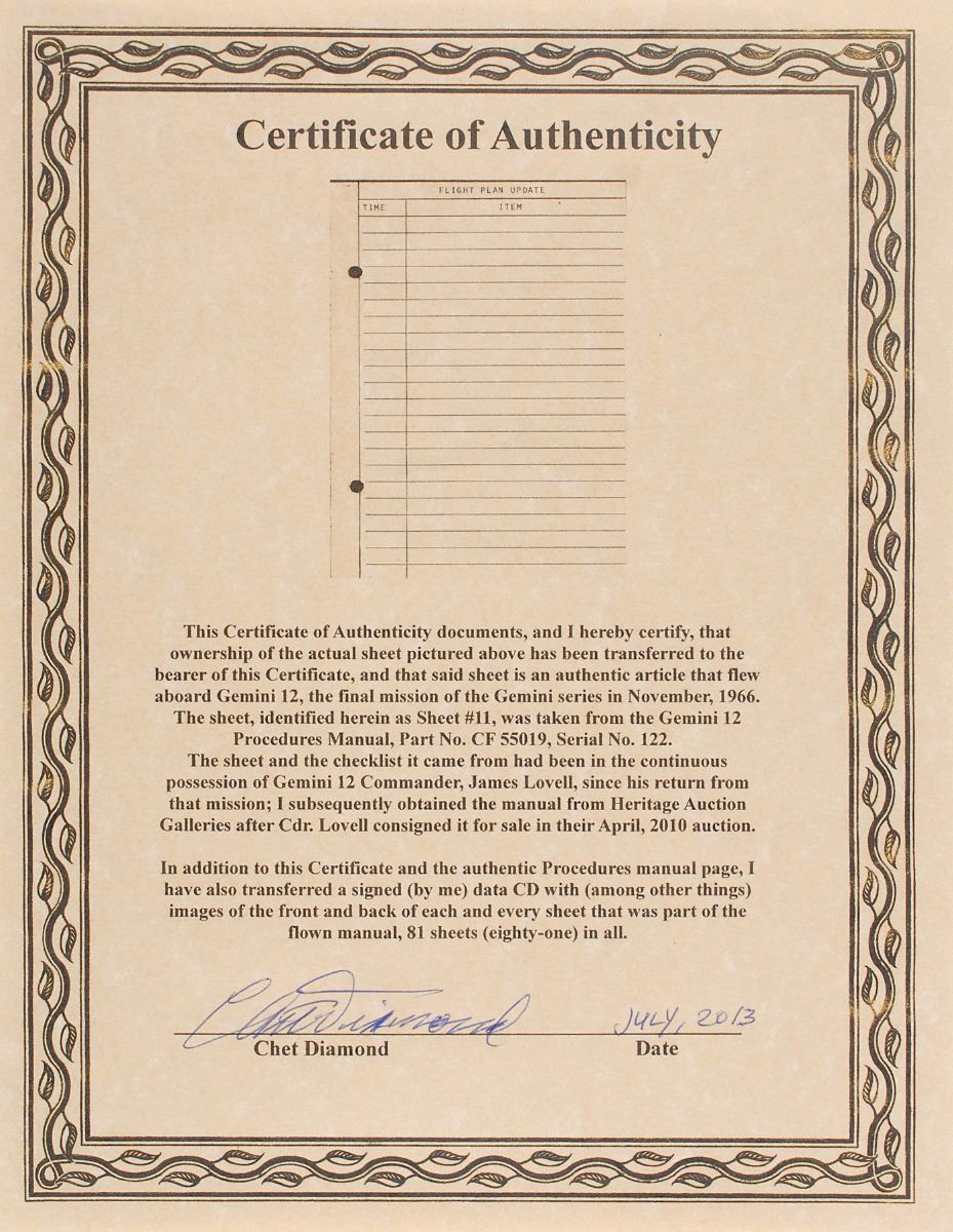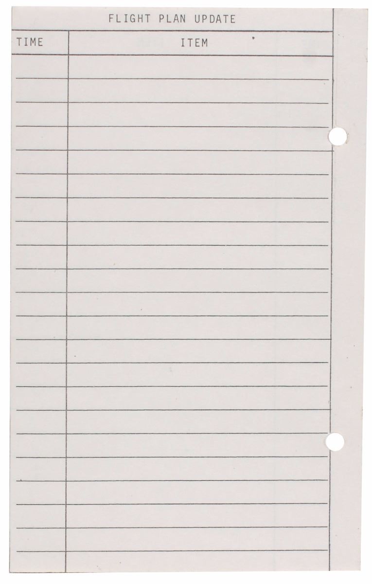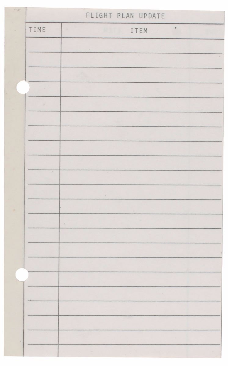 Flown unused two-sided checklist page carried on board Gemini 12, 5 x 8, from the ‘Procedures S/N 122’ flight-log flown on the mission, captioned “Flight Plan Update,” with unfilled columns for “Time” and “Item.” In fine condition. Because of the very cramped crew compartment and tight weight restrictions aboard the small two-man craft, flown artifacts from Gemini missions are rarer than even those from Apollo flights; this Gemini 12 checklist page is one of the very few items ever made available from this important and final flight of the Gemini series. Accompanied by a certificate of authenticity and a data CD with thorough documentation and scans of all 81 sheets of the complete S/N 122 Procedures flight-log.