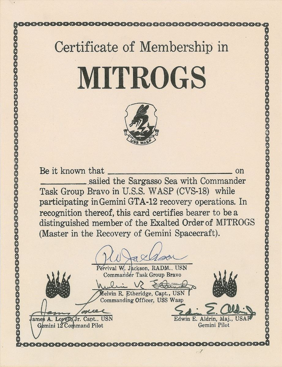 Unissued certificate of membership in MITROGS, 8.5 x 11, no date, in part: “This card certifies bearer to be a distinguished member of the Exalted Order of MITROGS (Master in the Recovery of Gemini Spacecraft).” Signed at the bottom in black felt tip, “James Lovell” and “Edwin E. Aldrin, Jr.” Also signed by Percival W. Jackson and Melvin R. Etheridge. In fine condition. After nearly four days in orbit, the crew of Gemini 12 were recovered by the USS Wasp on November 15, 1966.