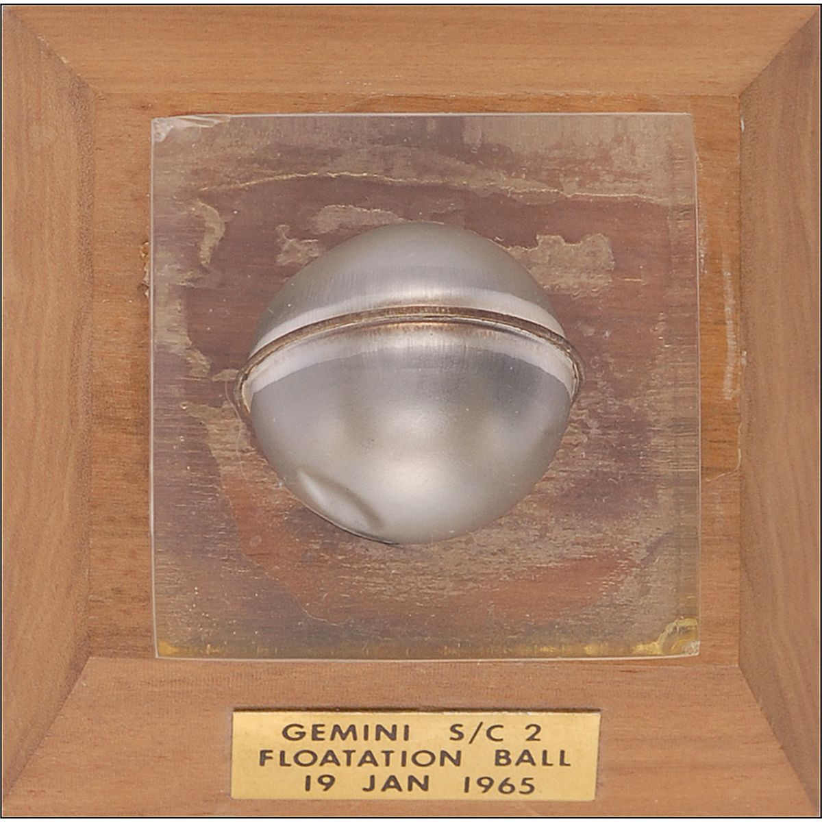 A flown flotation ball for Gemini 2. Aluminum sphere measures approximately 1.25? in diameter and is encased in an acrylic cube, which is in turn affixed to a 3.5 x 3.5 wooden base with a plaque that reads, “Gemini S/C 2, Flotation Ball, 19 Jan 1965.” After the experience on Grissom's Mercury flight (MR-4) in which the spacecraft Liberty Bell 7 sank after splashdown, NASA designed the Gemini spacecraft with aluminum flotation spheres to help maintain the spacecraft's buoyancy.