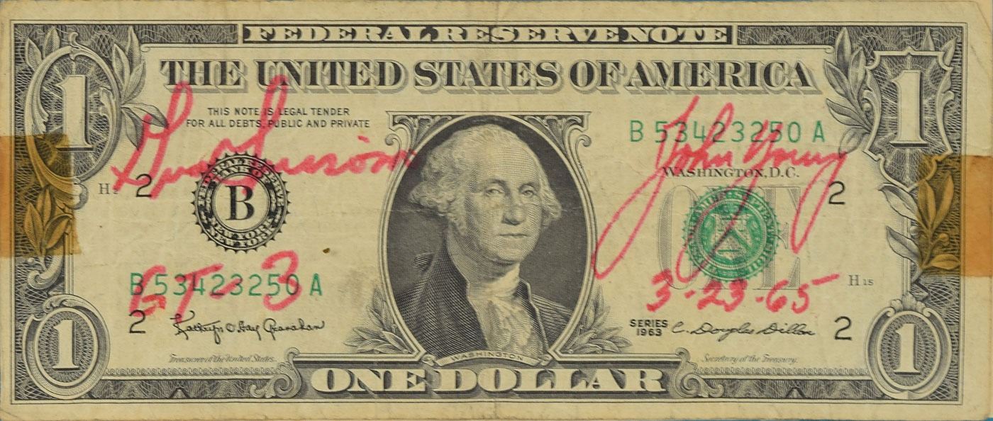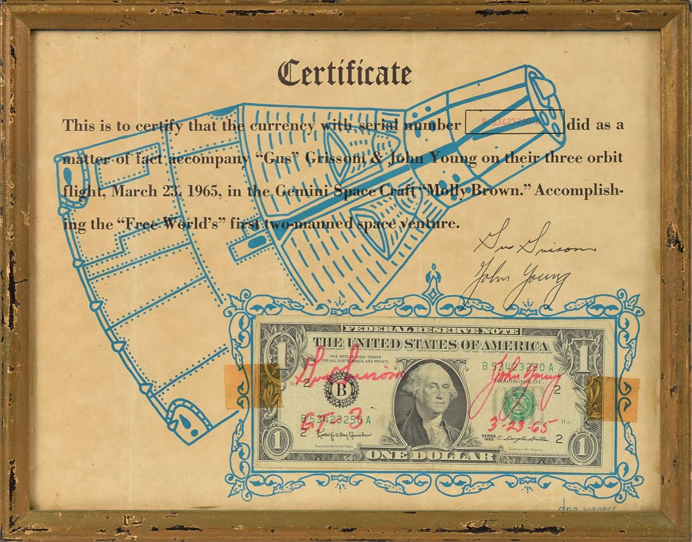 Series 1963 one-dollar bill, serial number B53423250A, flown aboard the Gemini 3 space capsule Molly Brown, nicely signed in red felt tip, “Gus Grissom, GT-3” and “John Young, 3-23-65.” The bill is affixed to its original 10.5 x 8 certificate by Don Wagner, which features a capsule and preprinted text: "This is to certify that the currency with serial number B53423250A did as a matter of fact accompany 'Gus' Grissom & John Young on their three orbit flight, March 23, 1965, in the Gemini Space Craft 'Molly Brown.' Accomplishing the 'Free World's' first two-manned space venture." The certificate is also signed in black ballpoint by Young, with the Grissom signature a printed facsimile. Framed to a slightly larger size. In very good to fine condition, with light soiling to the certificate, and toning to the tape holding the bill in place.